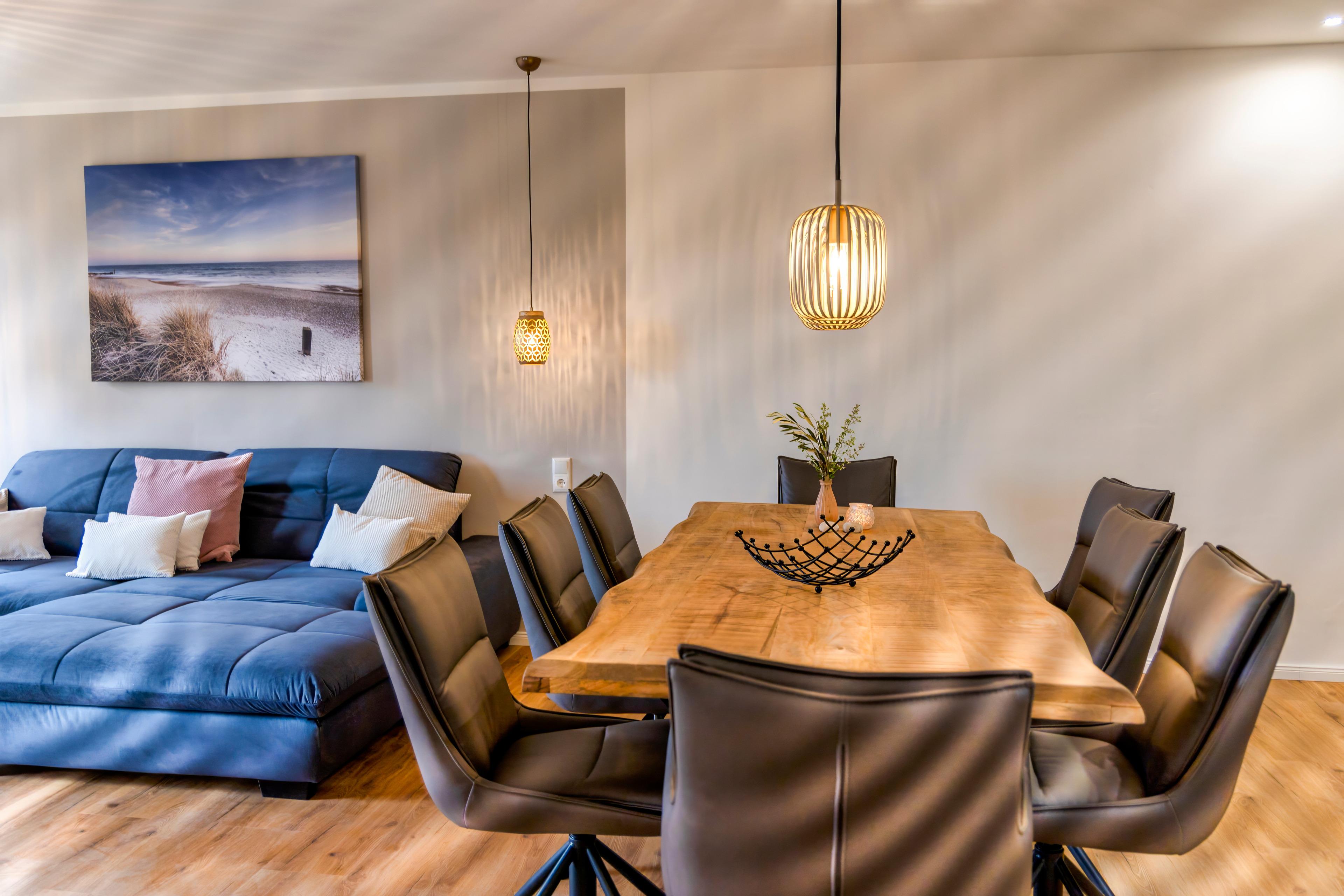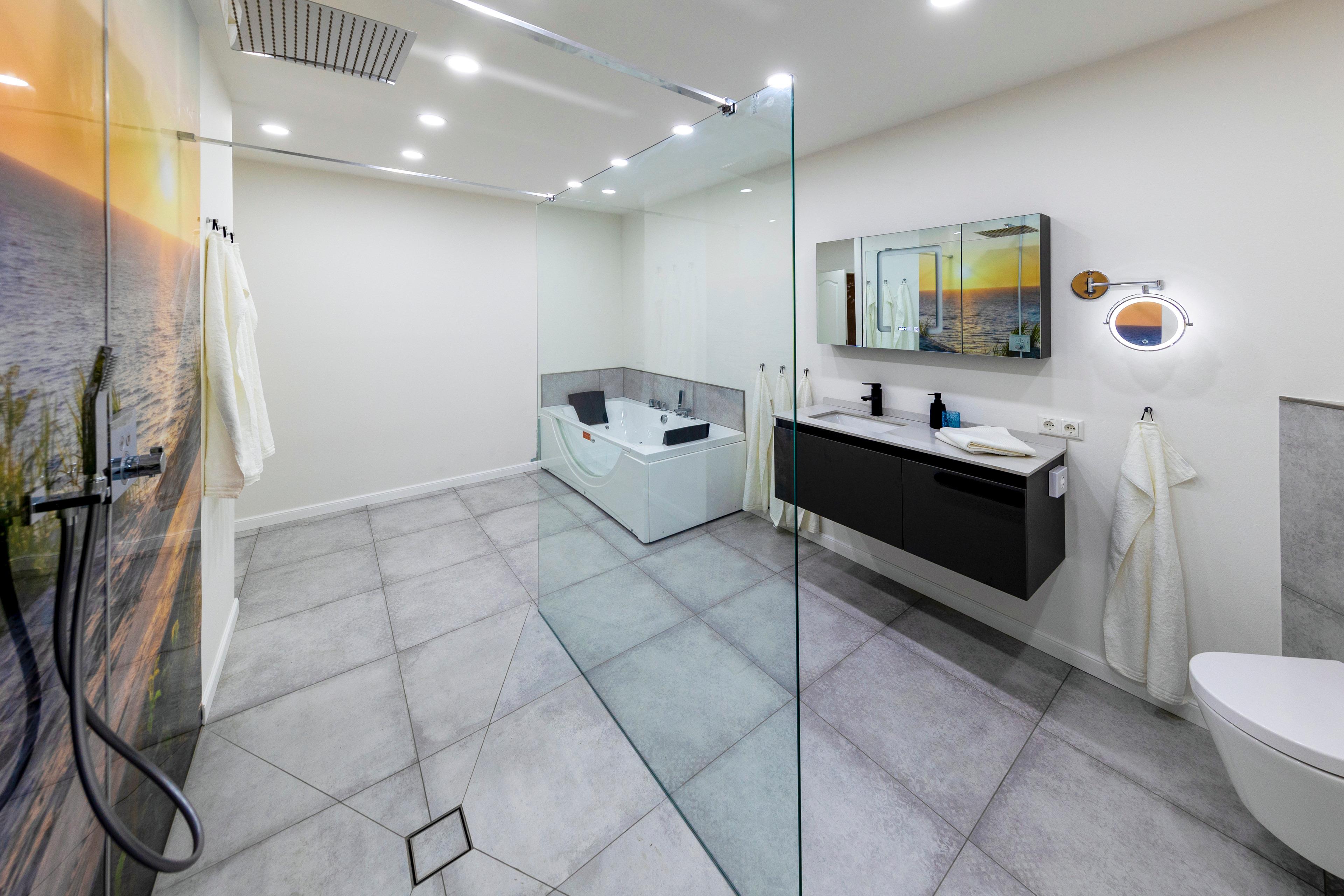 Eine Fußbodenheizung sorgt im ganzen Haus für wohlige Wärme und eine Klimaanlage rundet das ganze ab. In den stilvollen Bädern finden Sie bodengleiche Duschen und Infrarotkabinen, die nach einem erfrischenden Tag an der Nordsee zum Aufwärmen einladen. Genießen Sie ein Glas Wein bei Kerzenschein im großen Whirlpool und entspannen Sie anschließend im bequemen Boxspringbett, vielleicht mit einem Film auf dem großen Flachbildfernseher.