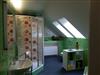 Das Badezimmer mit 2 Dachfenstern verfügt über Dusche, Eckbadewanne, WC, Fön und Kosmetikspiegel, Waschmaschine und Trockner.