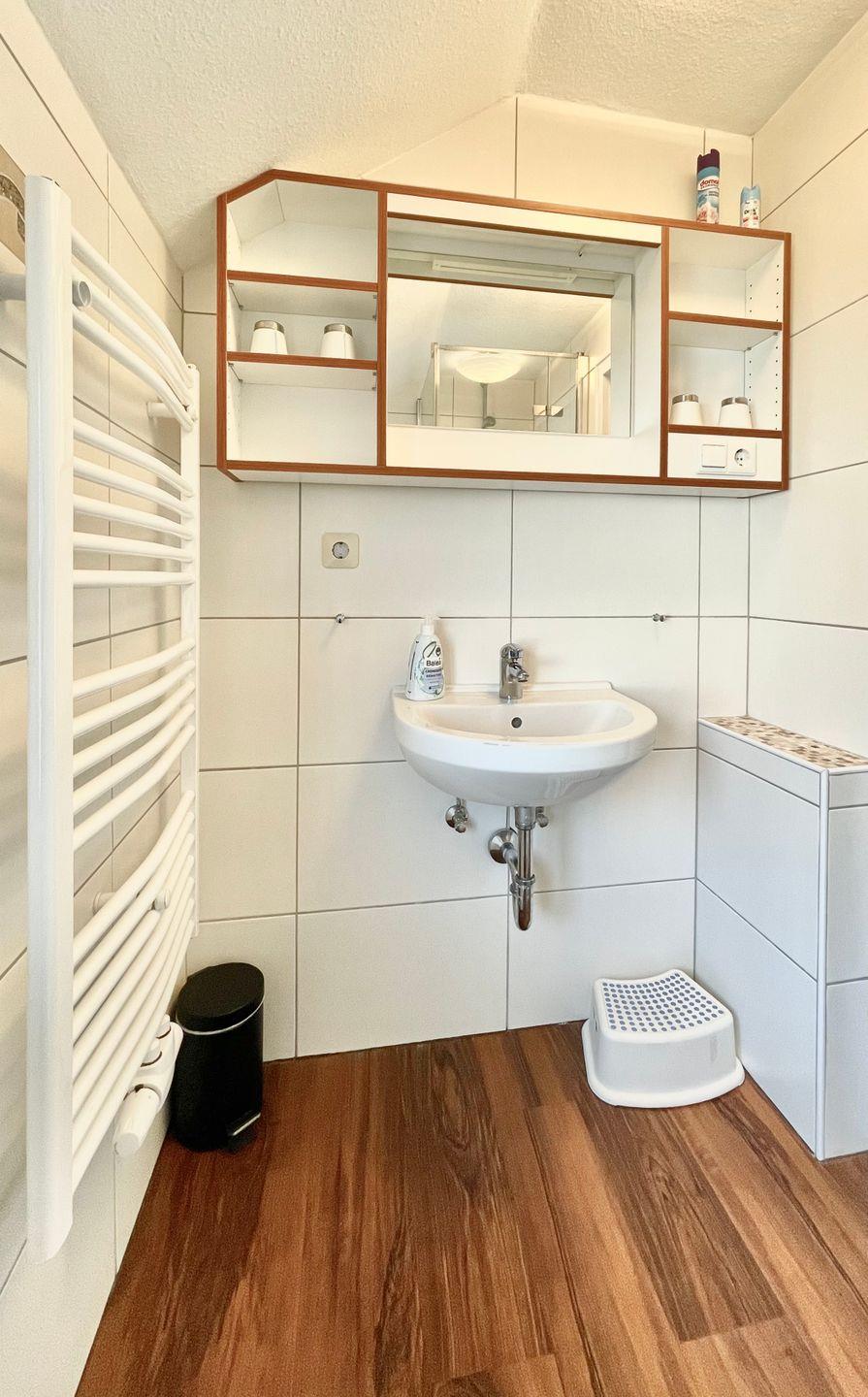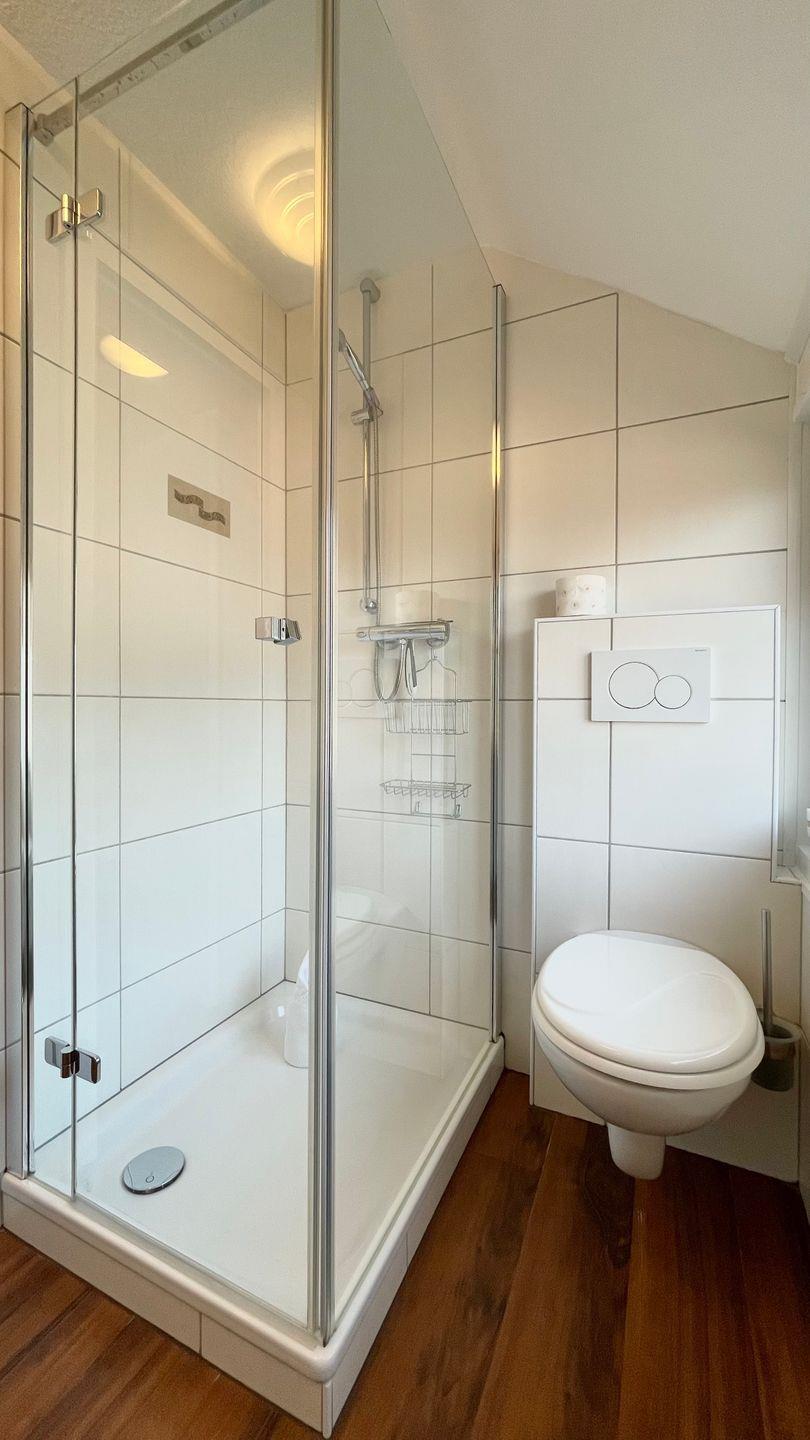 Das Bad bietet eine Dusche, Waschtisch und WC.