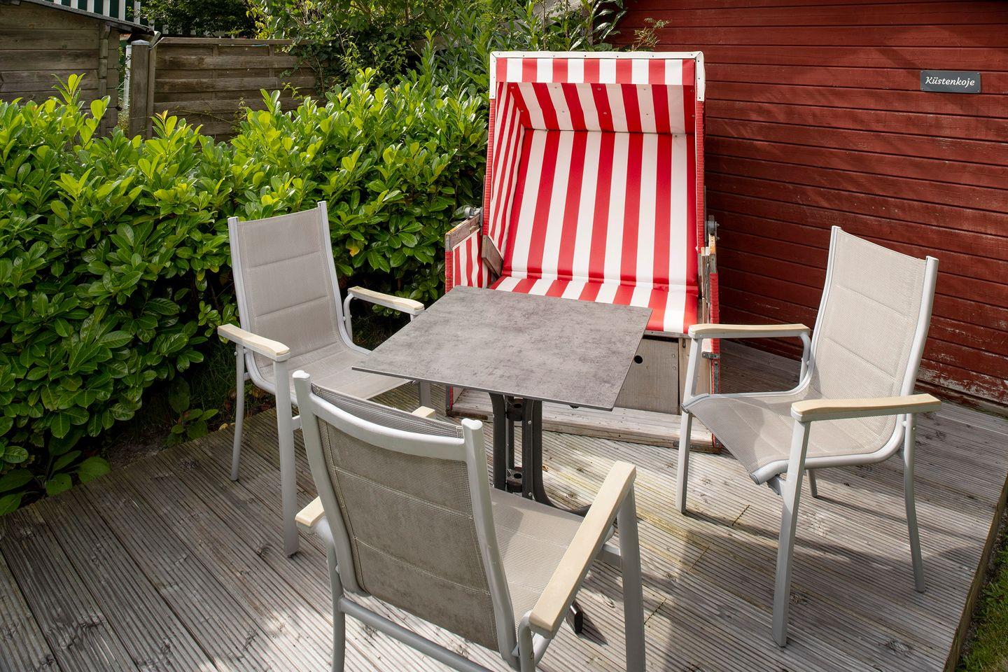 Der Gartenbereich hinter dem Haus hat eine große Terrasse mit Strandkorb und Gartenmöbeln.