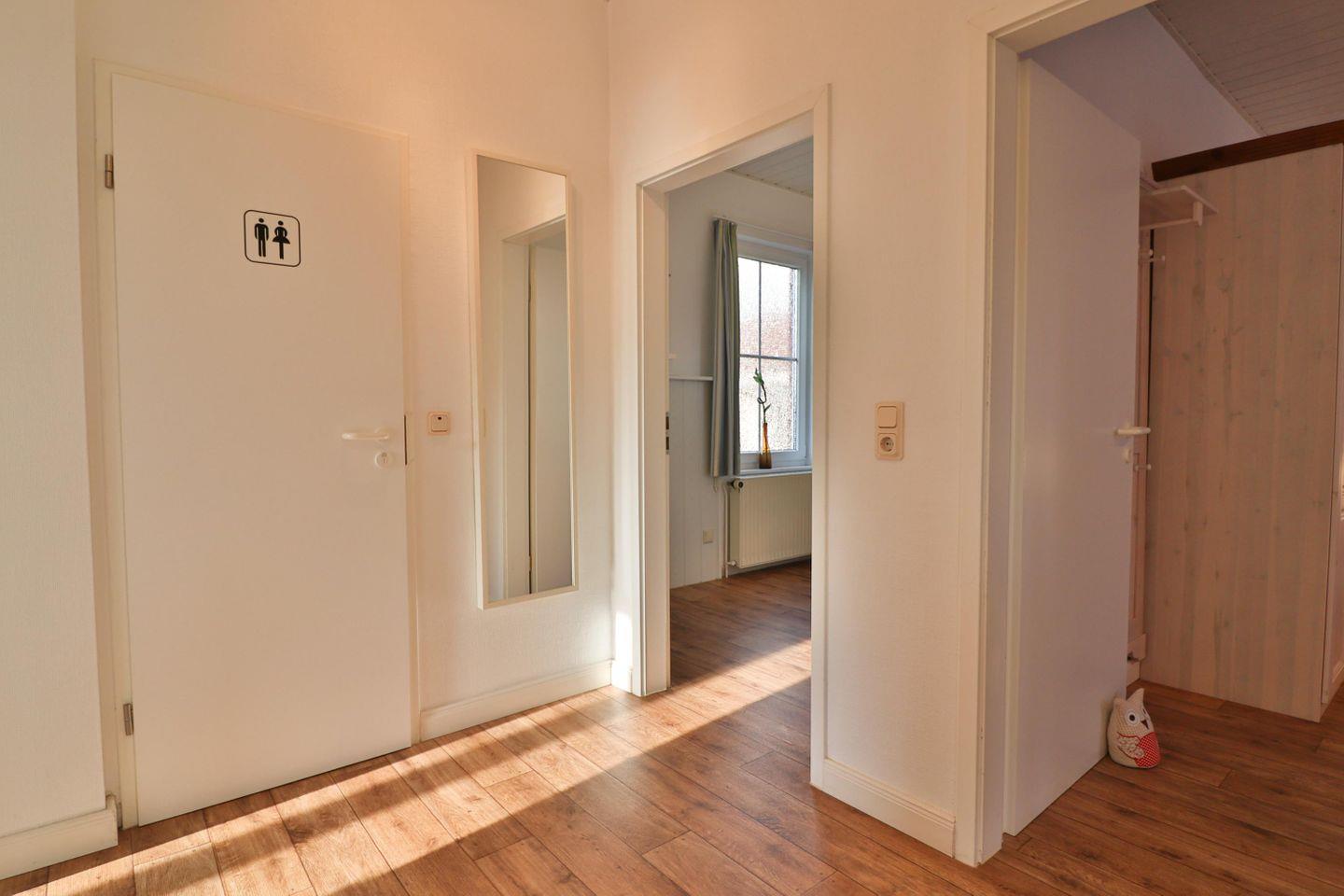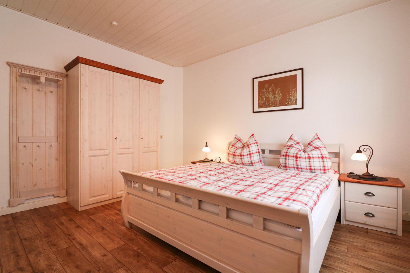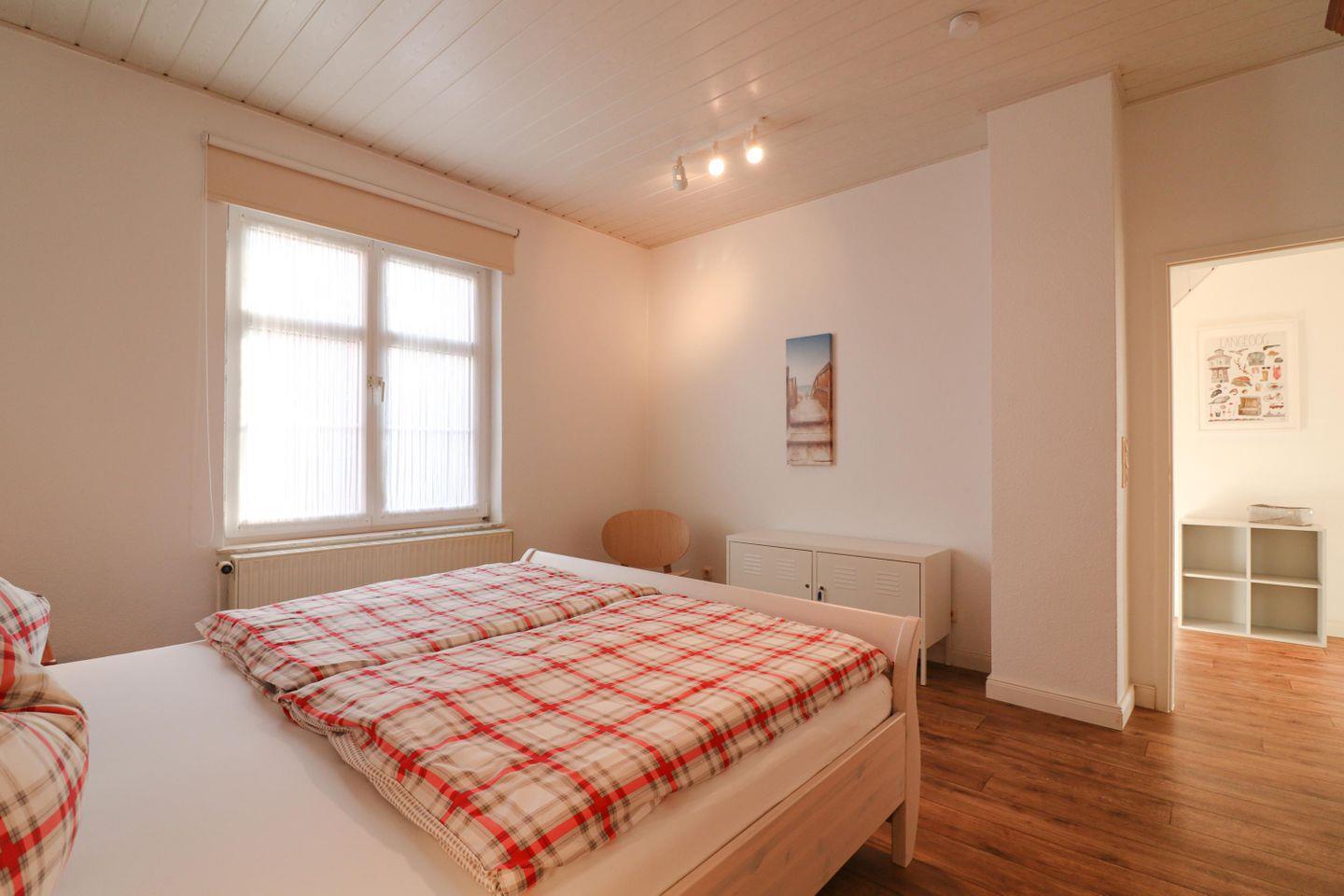 Die großzügige Raumaufteilung umfasst insgesamt zwei Zimmer. Im Schlafzimmer finden Sie ein komfortables Doppelbett (180 x 200 cm) sowie einen großzügigen Kleiderschrank, der genug Platz für Ihre Habseligkeiten bietet, während das gemütlich gestaltete Wohnzimmer mit Sessel und einer gemütlichen, einladenden Sofaecke zum Ausruhen und Verweilen einlädt. Sichtschutz an allen Fenstern sowie liebevoll ausgewählte Details wie Bücher im Wohnbereich sorgen für ein wohnliches Ambiente.