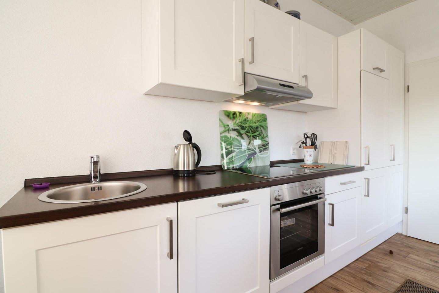 Die separate Küche bietet Ihnen einen Esstisch für gemeinsame Mahlzeiten. Die moderne Küchenzeile ist umfangreich ausgestattet: Ein 4-Platten-Herd, Backofen, Kühlschrank mit Gefrierfach, Spülmaschine, Kaffeemaschine, Wasserkocher sowie vielfältige Küchenutensilien, Geschirr und Besteck stehen Ihnen zur Verfügung. Bettwäsche, Handtücher und Geschirrhandtücher liegen für Sie bereit.