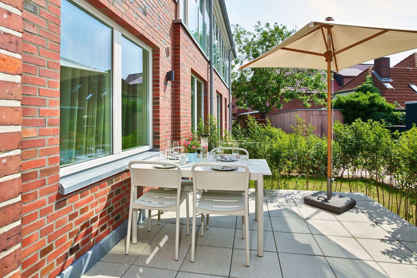 Das Badezimmer verfügt über Handtuchwärmer, Regendusche, WC, Waschtisch, Föhn und Kosmetikspiegel. Die behagliche Wohnung bietet euch überdies eine Terrasse mit Gartenmöbeln und Sonnenschirm.