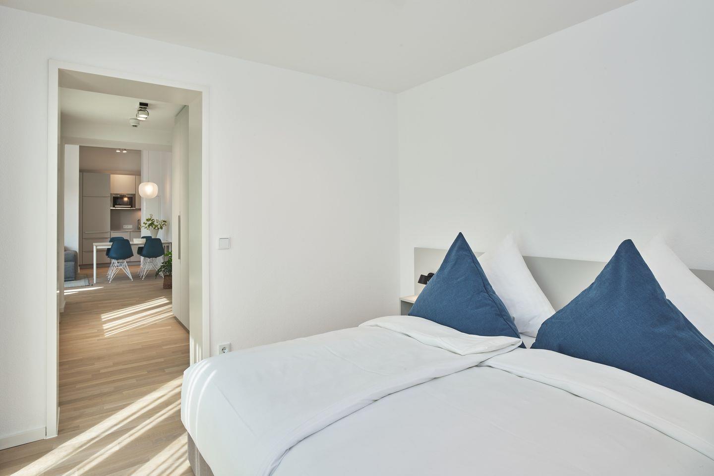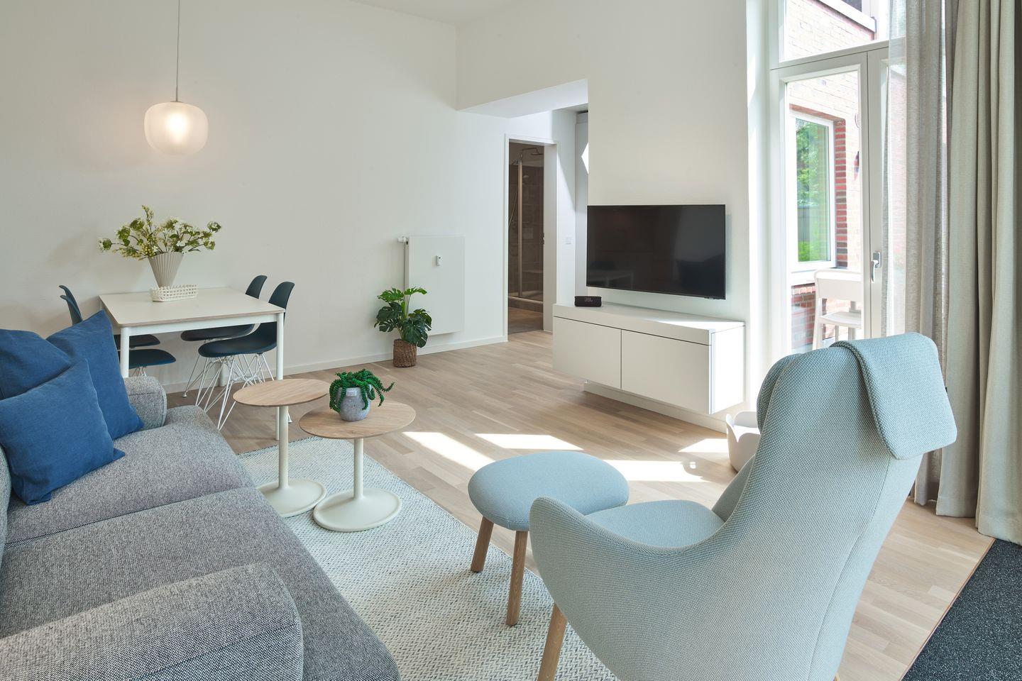Das geschmackvoll eingerichtete Nichtraucher-Apartment verfügt über kostenfreies WLAN, bodentiefe Fenster und eine voll ausgestattete offene Küche mit Geschirrspüler, Kühlschrank mit Gefrierfach, Filterkaffeemaschine, Toaster, Wasserkocher, Mikrowelle und 2-Felder-Induktionsherd sowie über einen behaglichen Wohn-Essbereich. Im Wohnbereich befinden sich ein SMART-TV (43 Zoll) und ein Bluetooth-Lautsprecher.