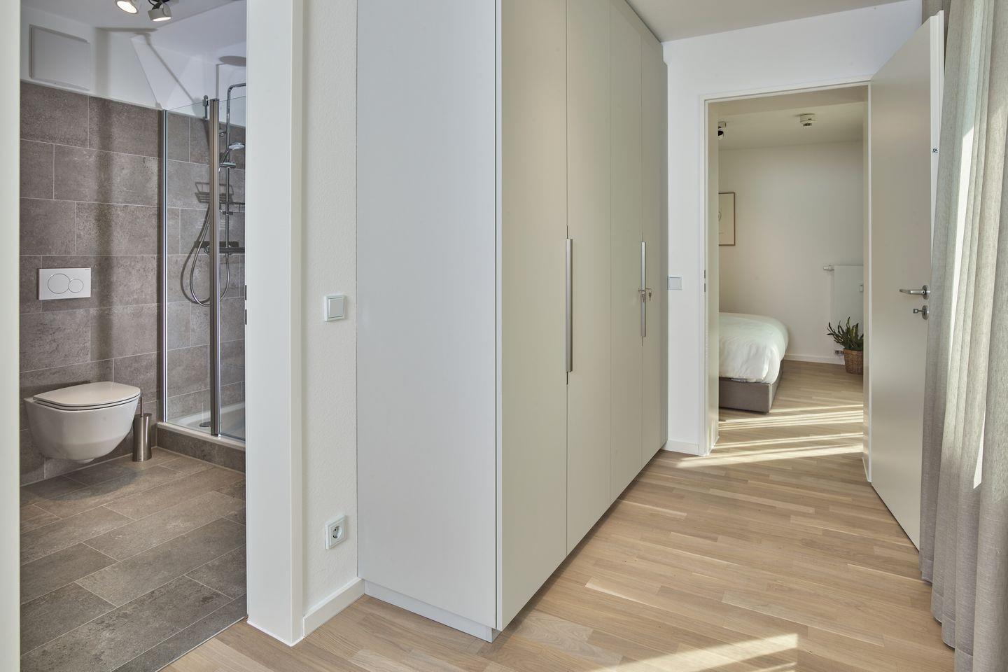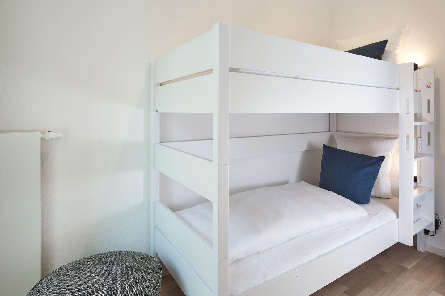 Die Schlafzimmer beinhalten ein modernes Boxspring-Doppelbett (1,80 x 2,00 m) und Kleiderschrank bzw. ein Etagenbett (0,90 x 2,00 m).