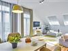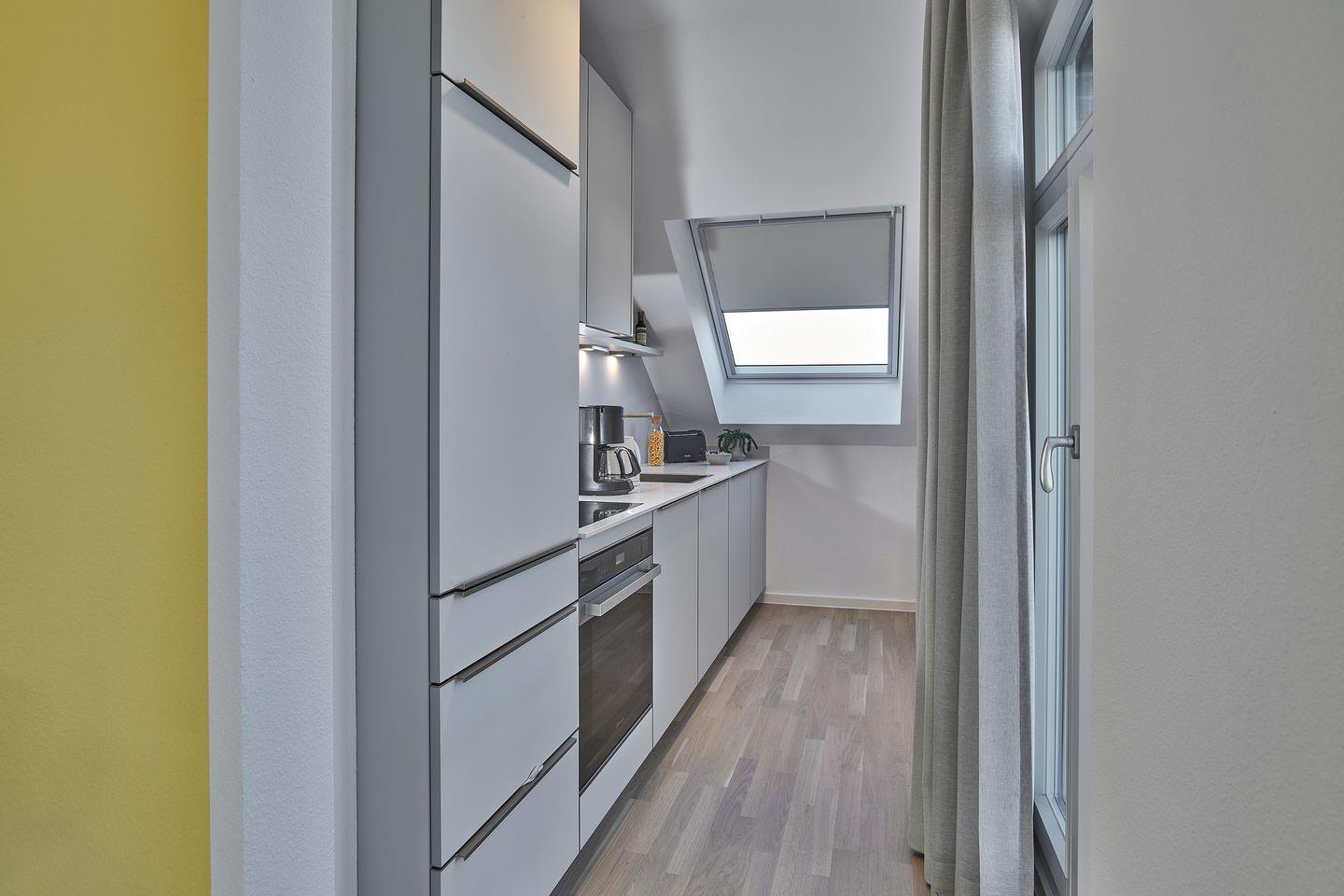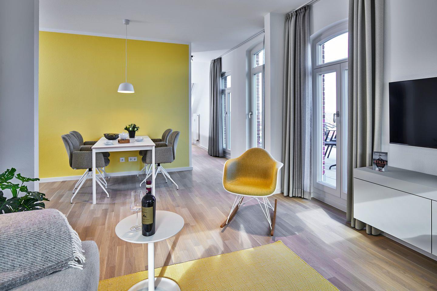 Das geschmackvoll eingerichtete Nichtraucher-Apartment verfügt über kostenfreies WLAN, bodentiefe Fenster und eine voll ausgestattete offene Küche mit Geschirrspüler, Kühlschrank mit Gefrierfach, Filterkaffeemaschine, Toaster, Wasserkocher, Backofen und 4-Felder Induktionsherd sowie über einen behaglichen Wohn-Essbereich. Im Wohnbereich befinden sich ein SMART-TV (43 Zoll) und ein Bluetooth-Lautsprecher.