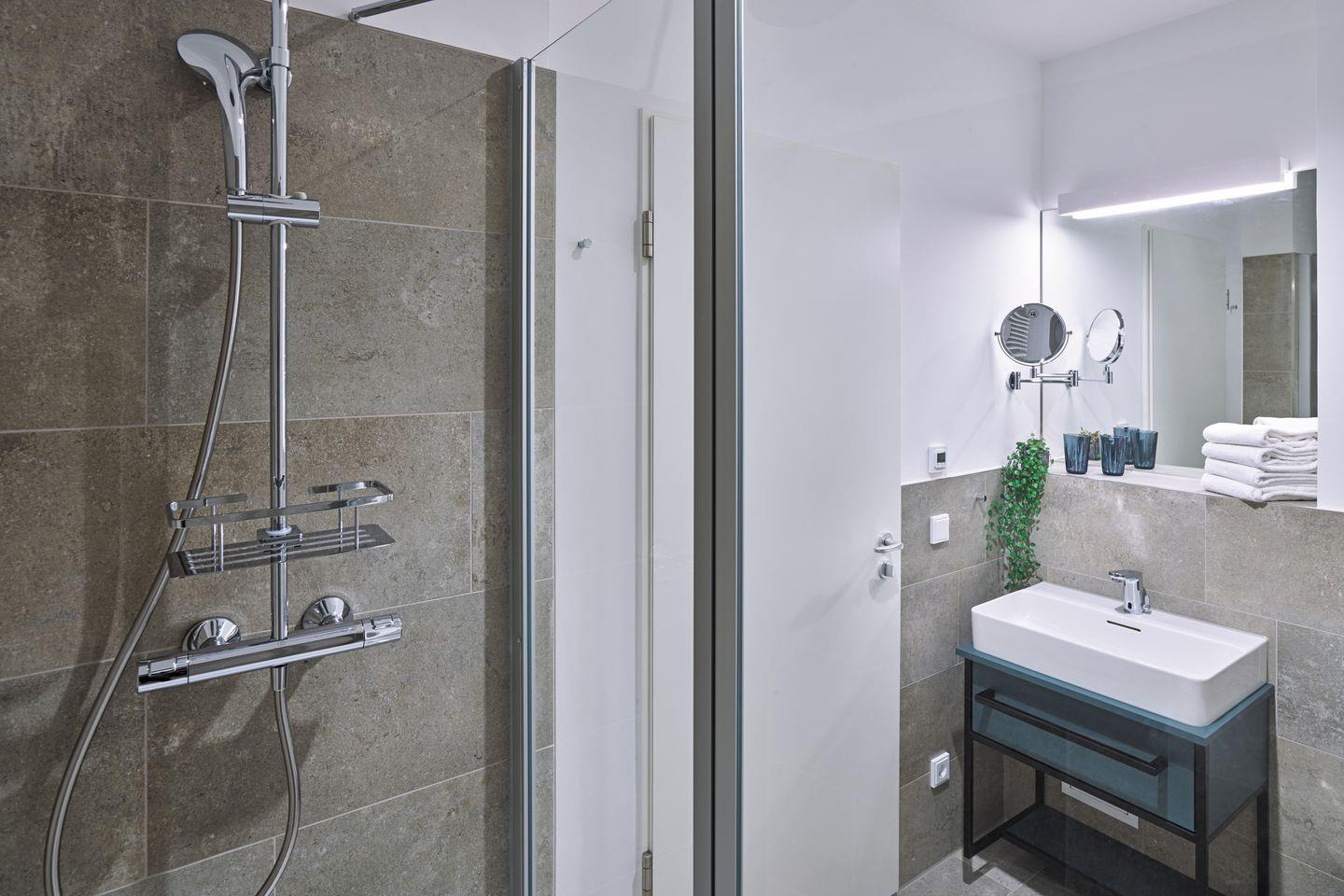 Das geschmackvoll eingerichtete Nichtraucher-Apartment verfügt über kostenfreies WLAN, bodentiefe Fenster und eine voll ausgestattete offene Küche mit Geschirrspüler, Mikrowelle mit Backofenfunktion, Kühlschrank mit Gefrierfach, Filterkaffeemaschine, Toaster, Wasserkocher und 2-Felder Induktionsherd sowie über einen behaglichen Wohn-Essbereich. Im Wohnbereich befinden sich ein SMART-TV (43 Zoll) und ein Bluetooth-Lautsprecher.