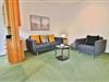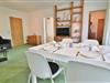 Der große Wohn- und Essbereich ist möbliert mit einem Sofa und Sessel für entspannte Abende, einem Fernseher sowie einem Esstisch mit vier Stühlen. Im Schlafzimmer befindet sich ein weiterer Stuhl, der bei Bedarf hinzugestellt werden kann.