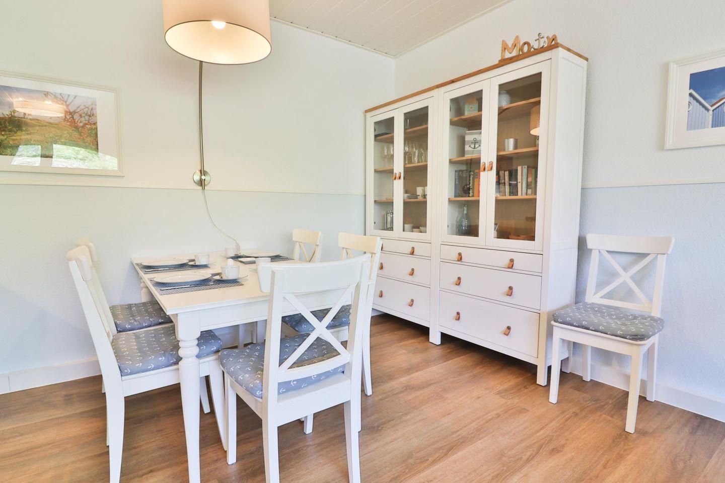 Besonderes Highlight ist die Terrasse der Ferienwohnung „Anker“! Hier können Sie sonnige Stunden im Freien verbringen und die frische Nordseeluft genießen. Ein Tisch mit Stühlen und ein komfortabler Strandkorb laden zu entspannten Momenten ein.