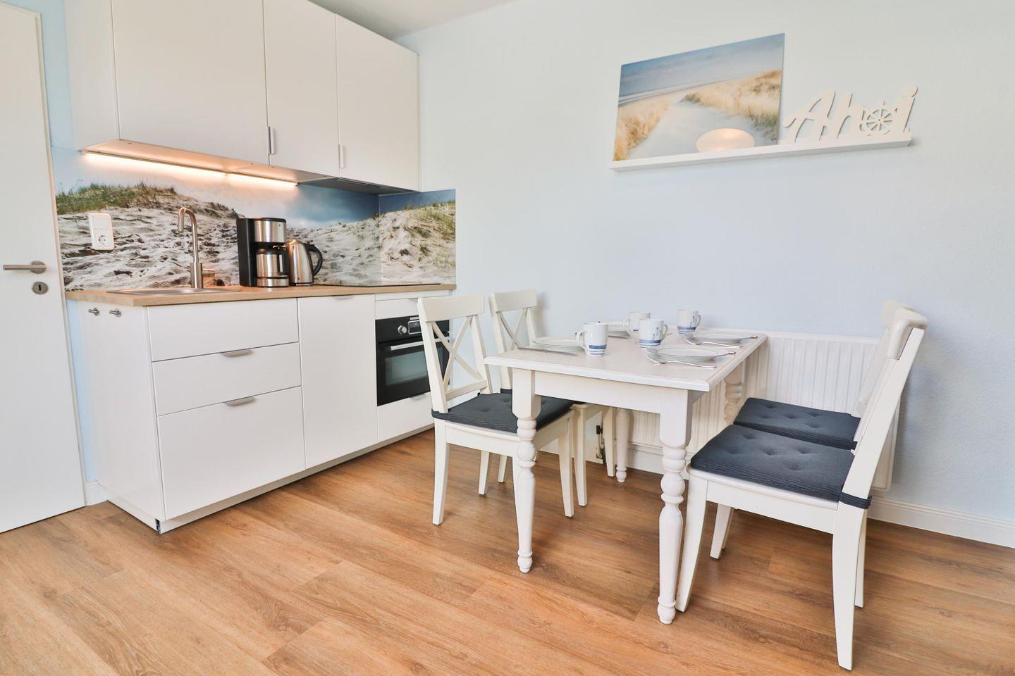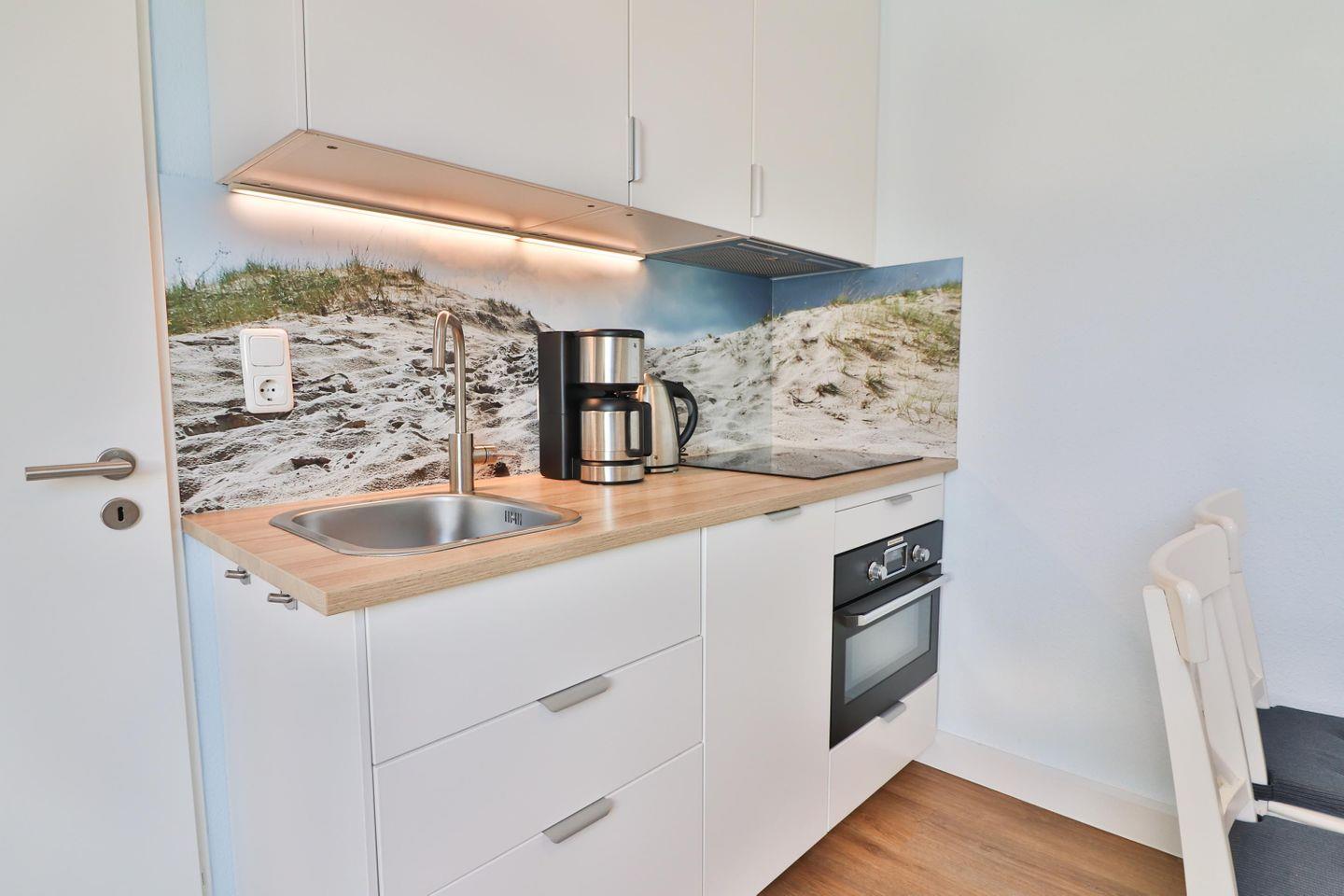 Die integrierte Küchenzeile lässt keine Wünsche offen und ist mit einem Ceranfeld, einem Backofen/Mikrowelle Kombigerät, einem Kühlschrank, einer Spülmaschine, einer Kaffeemaschine, einem Wasserkocher und einem Toaster ausgestattet. Sie können hier nach Herzenslust kochen und Ihre Lieblingsgerichte zaubern.