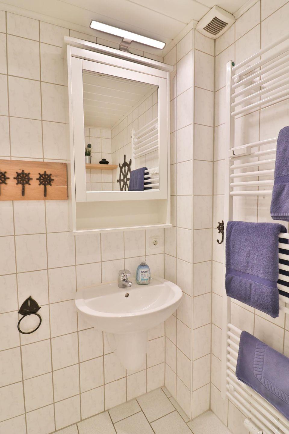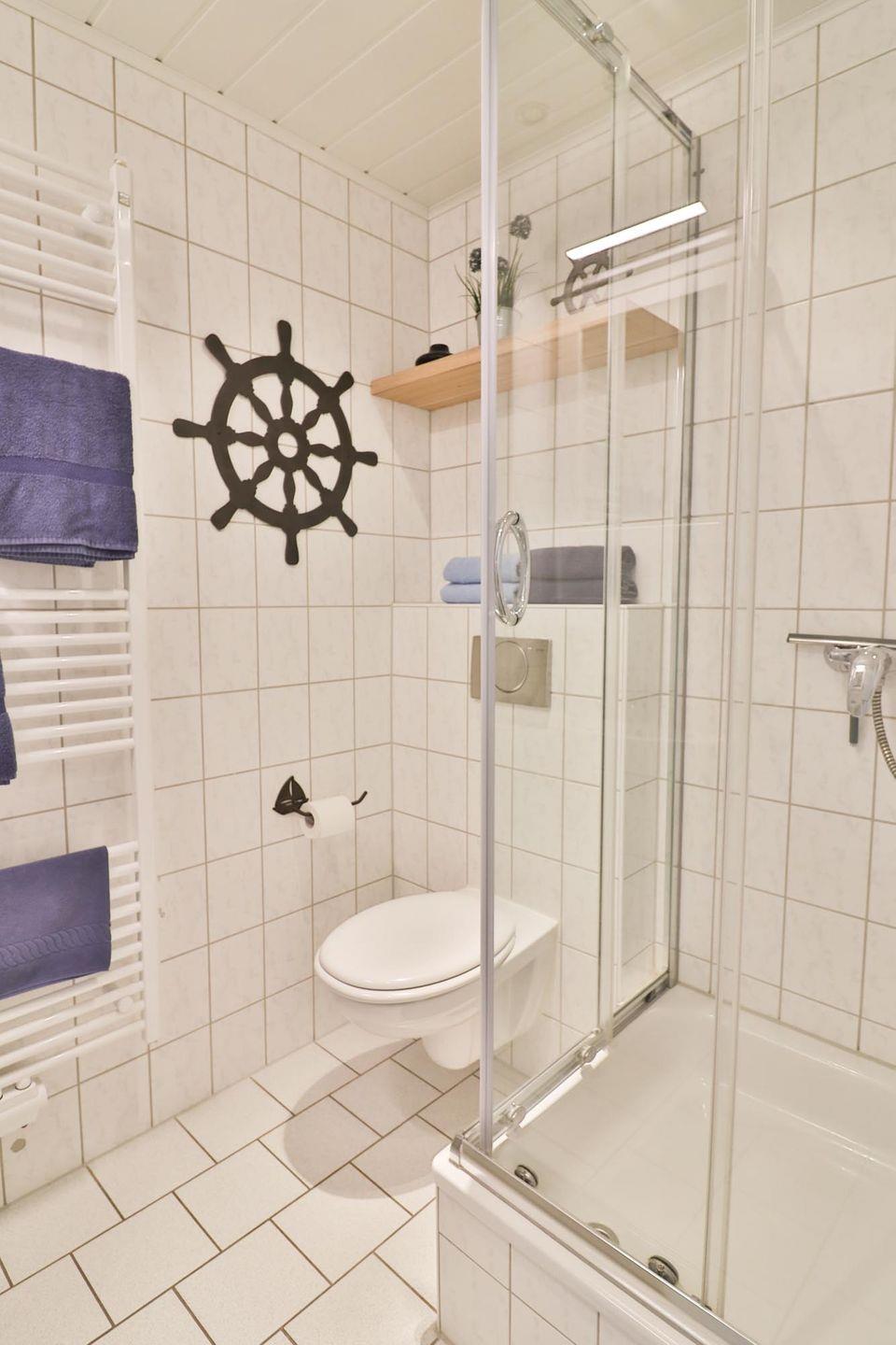 Das Badezimmer ist mit einer Dusche, einem WC und einem Waschbecken ausgestattet. Hier können Sie sich nach einem Strandtag erfrischen oder den Tag entspannt beginnen.