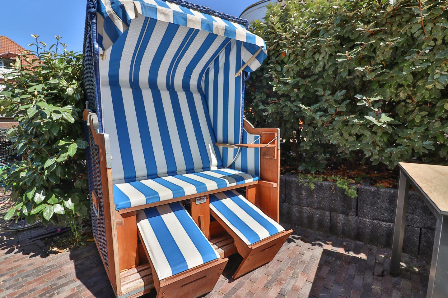 Für Sonnenanbeter und Seeluft-Genießer bietet die Ferienwohnung „Steuerrad“ eine eigene Terrasse neben dem Haus. Hier können Sie im bequemen Strandkorb entspannte Stunden in der Sonne verbringen oder den Tag bei einem Glas Wein ausklingen lassen.