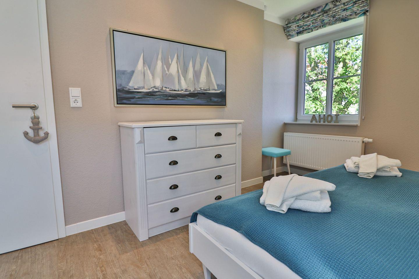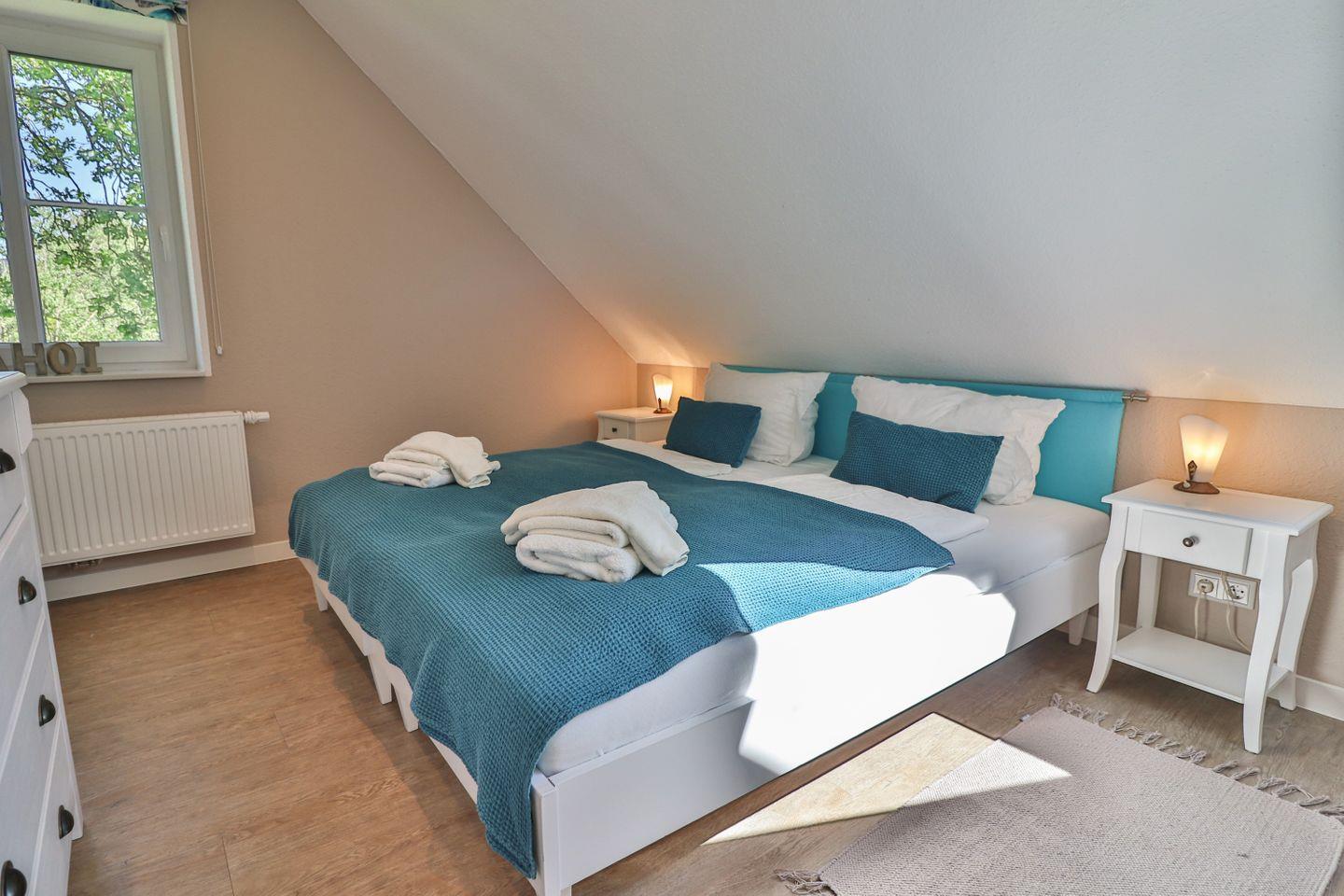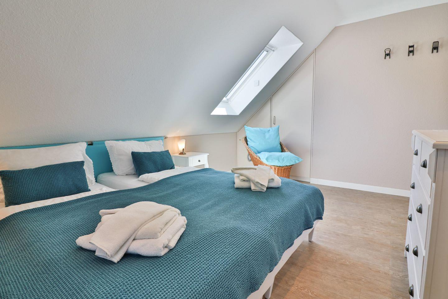 Die zentrumsnahe Lage ist nur eine der Annehmlichkeiten. Das Ferienhaus “Bi’n Eekboom” wurde liebevoll eingerichtet und erstreckt sich über zwei Etagen – Erdgeschoss und Obergeschoss. Es verfügt über zwei Schlafzimmer, wobei das erste mit einem gemütlichen Doppelbett (180 x 190 cm) und das zweite Schlafzimmer mit zwei bequemen Einzelbetten (je 90 x 190 cm) ausgestattet ist – perfekt für erholsame Nächte auf Langeoog.