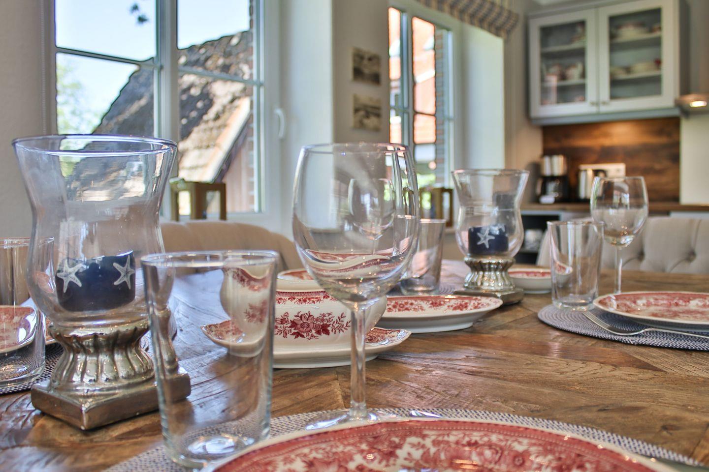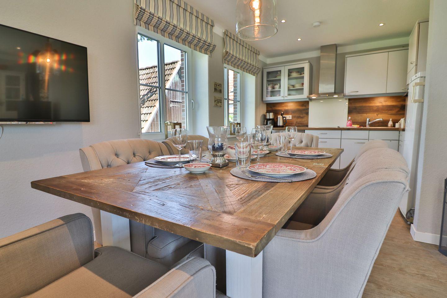 Der großzügige Wohn- und Essbereich bildet das Herzstück des Hauses. Hier finden Sie eine voll ausgestattete Küchenzeile, die Ihre kulinarischen Ideen zum Leben erweckt. Der große Esstisch mit bequemen Stühlen lädt zum ausgiebigen Schlemmen und gemütlichen Beisammensein ein.