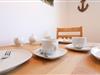Die separate Küche ist komplett ausgestattet und lässt keine Wünsche offen. Ein Vier-Platten-Ceranfeld, ein Kühlschrank, eine Mikrowelle mit Grillfunktion, eine Spülmaschine, eine Kaffeemaschine, ein Wasserkocher und ein Toaster stehen Ihnen zur Verfügung. Der Essbereich in der Küche schafft eine gemütliche Atmosphäre für gemeinsame Mahlzeiten.