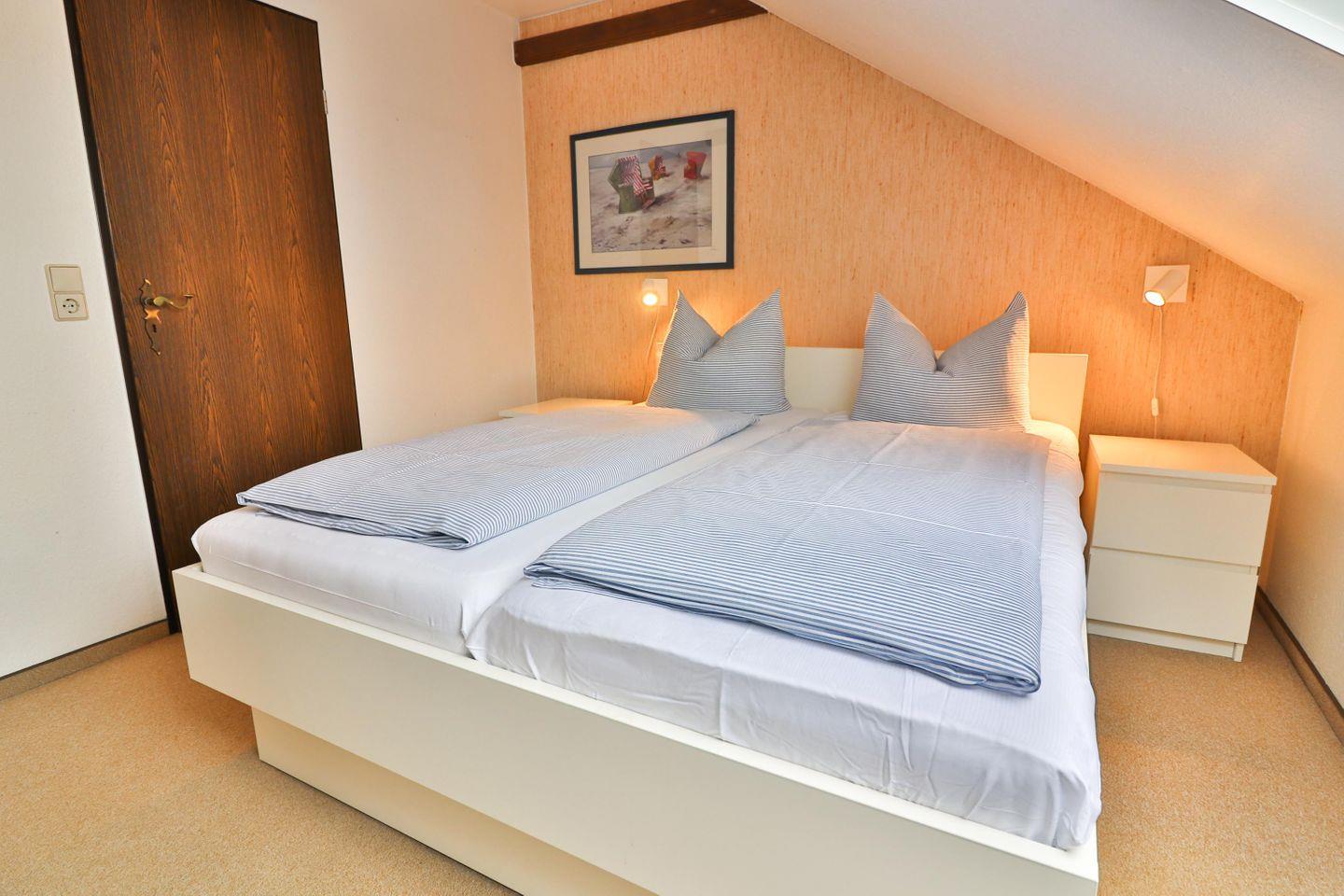 Das Badezimmer mit Dusche und WC bietet Ihnen die nötige Erfrischung nach einem Tag am Strand. Im Dachgeschoss erwartet Sie ein geräumiges Schlafzimmer mit einem komfortablen Doppelbett (160 x 200 cm), Kleiderschrank und einer kleinen Sitzecke für entspannte Stunden.