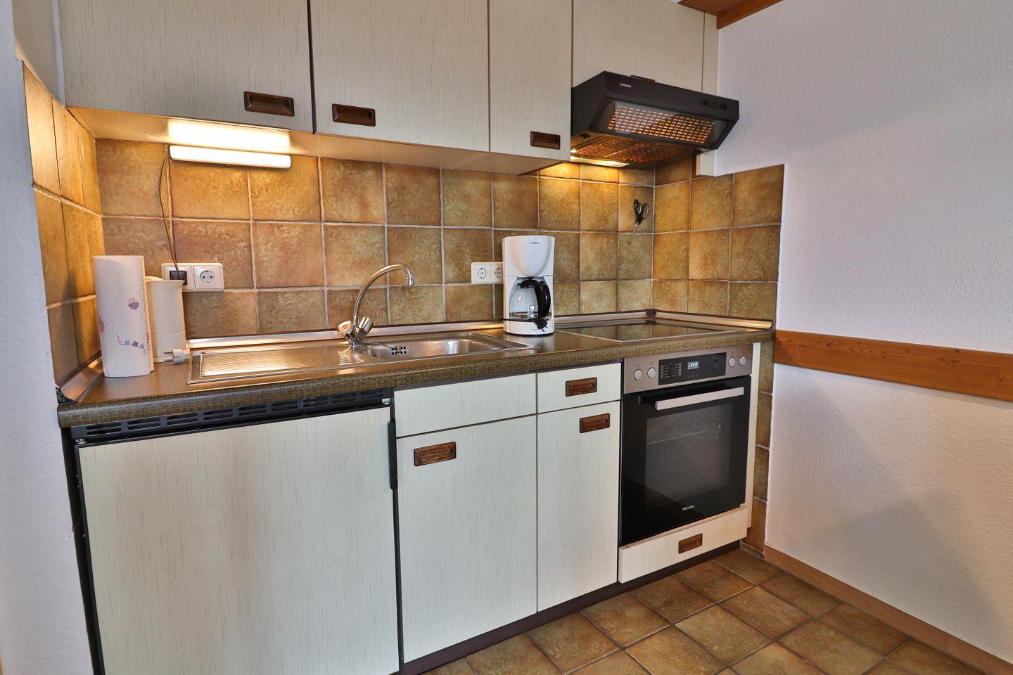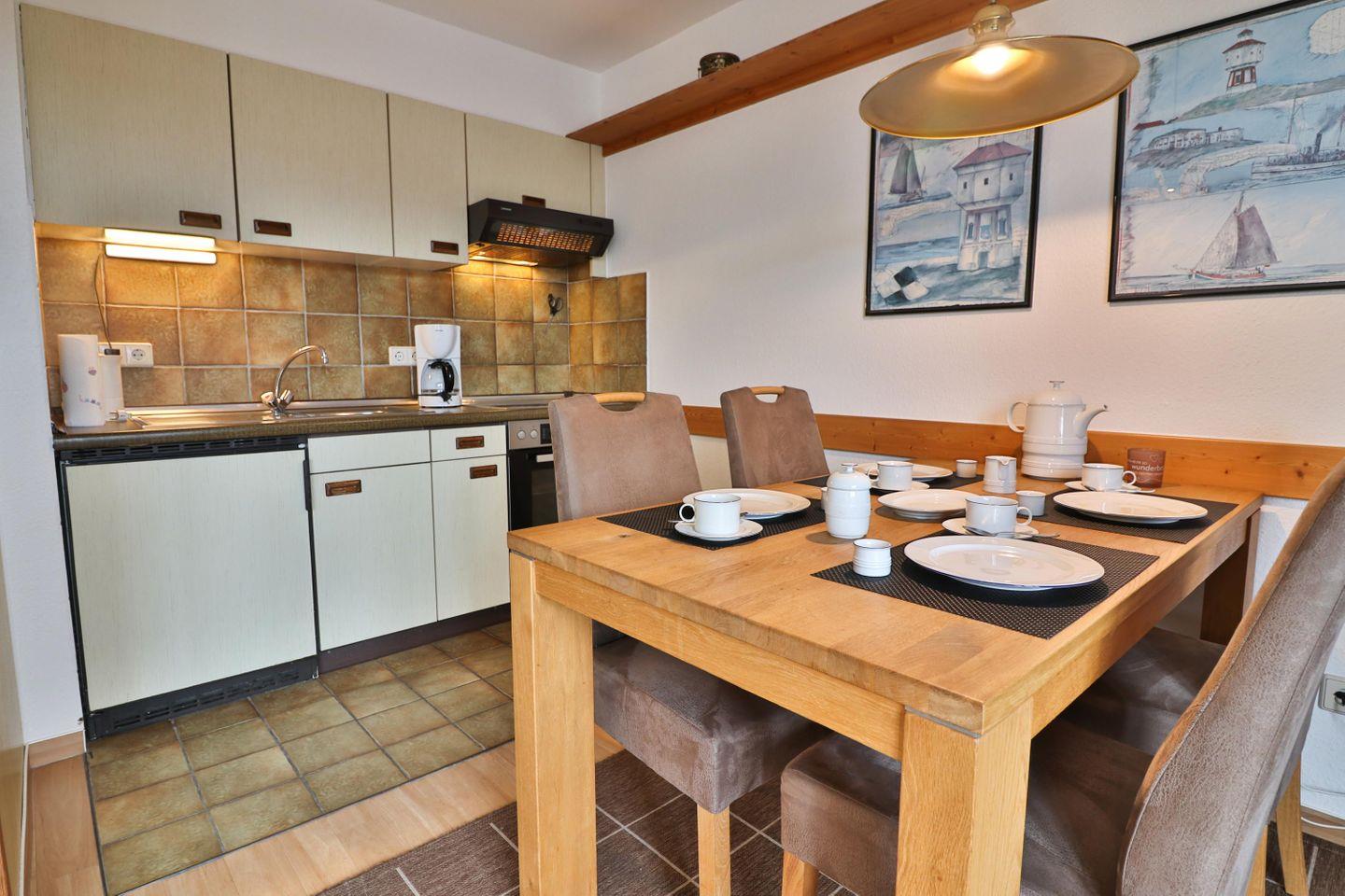 Genießen Sie den Komfort eines Wohn-Esszimmers mit einer voll ausgestatteten Küchenzeile, bestehend aus Ceranfeld, Backofen, Kühlschrank mit Gefrierfach, Kaffeemaschine, Wasserkocher, Eierkocher und allem, was das kulinarische Herz begehrt.