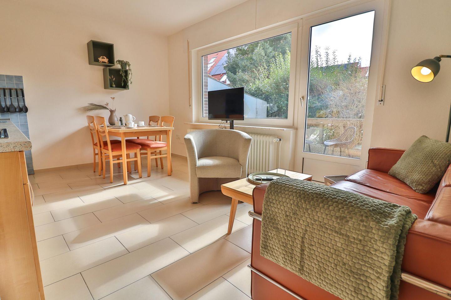 Die lichtdurchflutete Wohnung 1 im Erdgeschoss des Hauses „Libelle“ ist perfekt für bis zu vier Personen geeignet. Auf einer Fläche von 58 qm finden Sie alles, was Sie für Ihren Wohlfühl-Urlaub benötigen. Die Wohnung wurde im Frühjahr 2025 teilweise renoviert. Neben der Wohnung 1 befinden sich noch drei weitere Wohnungen im Haus Libelle. -Perfekt für ein Familientreffen für bis zu 17 Personen.