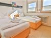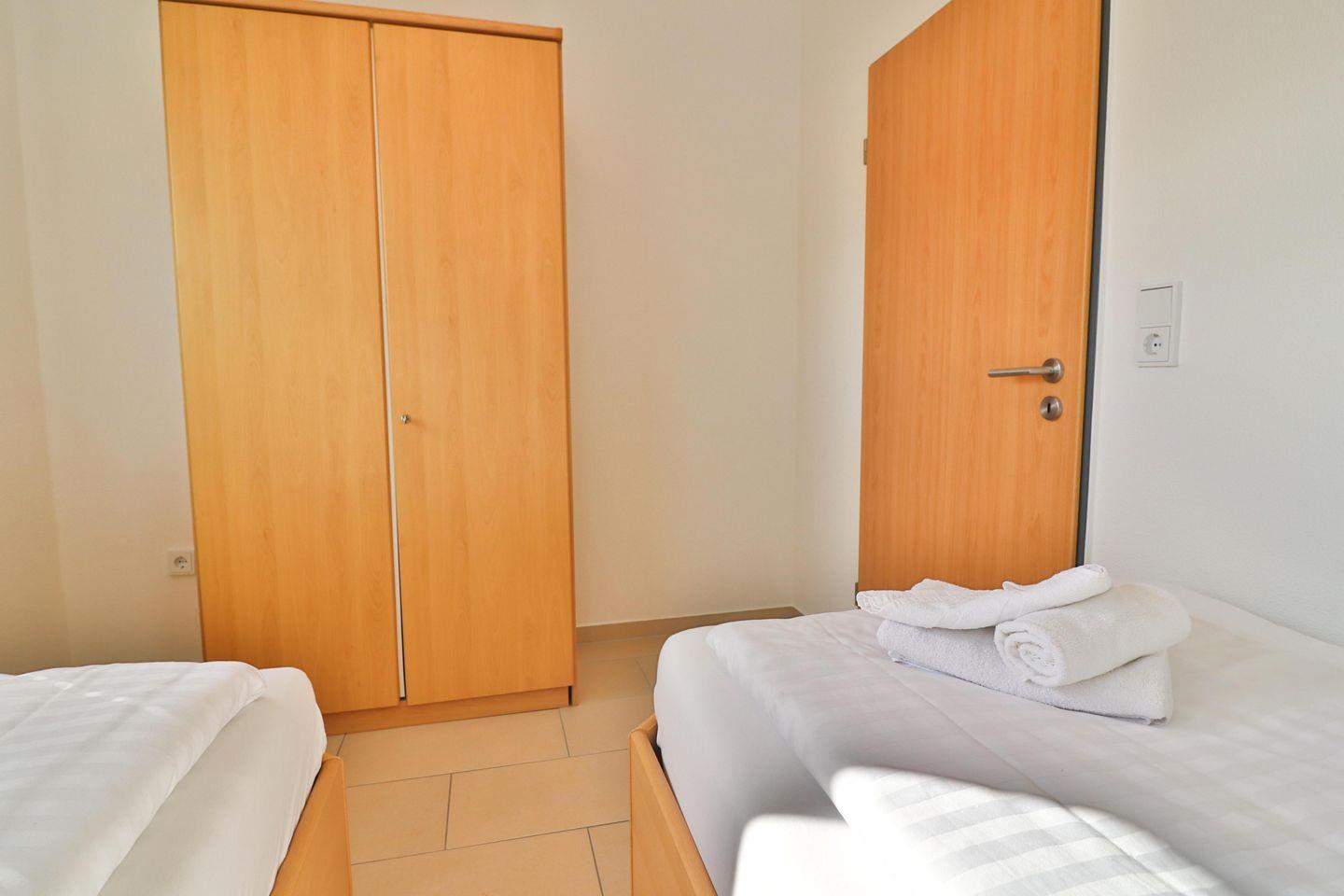 Diese Ferienwohnung verfügt über ein Hauptschlafzimmer mit einem komfortablen Doppelbett der Größe 180×200 cm, einem großen Kleiderschrank und praktischen USB-Steckdosen mit Leuchtfunktion zum einfachen Aufladen elektronischer Geräte. Das zweite Schlafzimmer ist mit zwei Einzelbetten der Größe 90×200 cm ausgestattet. Auch in diesem Zimmer steht Ihnen ein Kleiderschrank für Ihre persönlichen Gegenstände zur Verfügung.