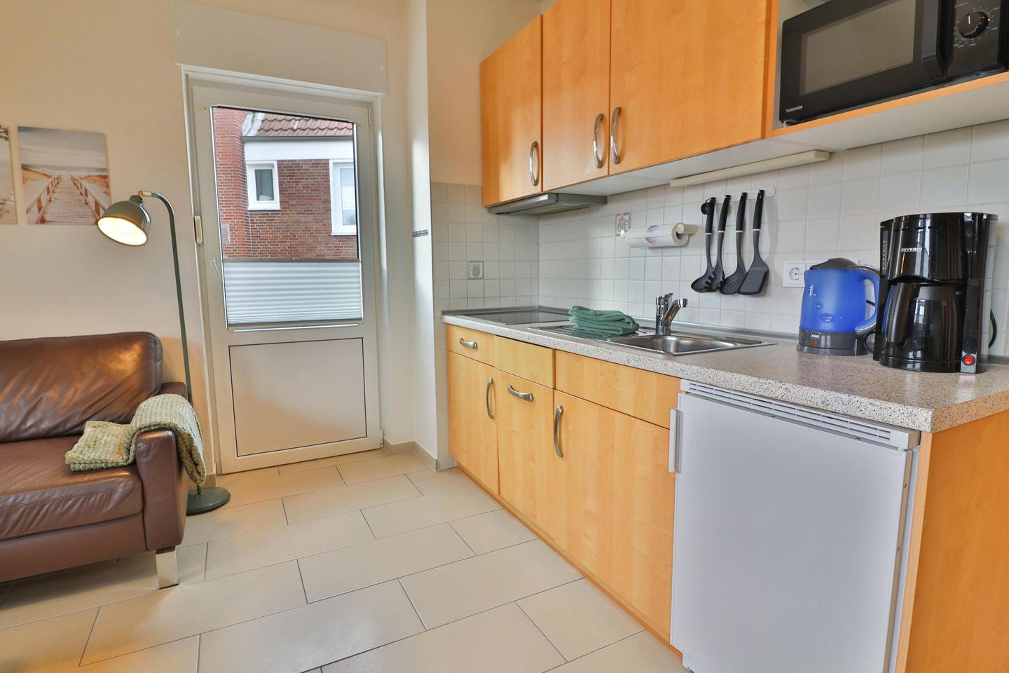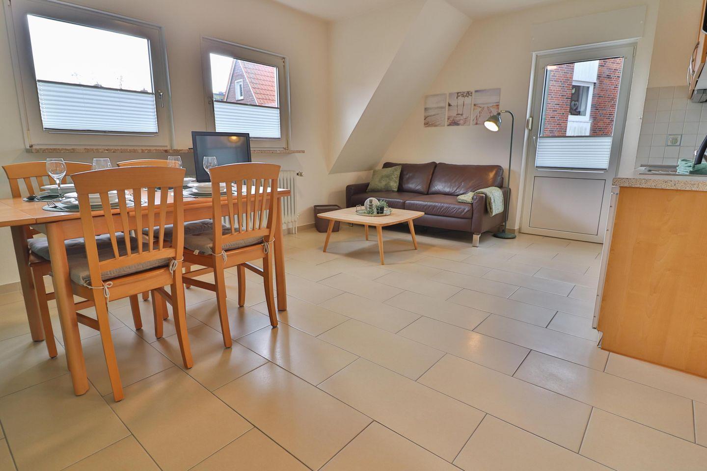 Die helle Wohnküche mit Zugang zum Balkon bietet Ihnen neben einem bequemen Sofa und einem Cocktailsessel, einen Esstisch sowie eine Küchenzeile, die reichlich Platz bietet, um ein leckeres Essen zu zaubern. Das 4-Platten-Ceranfeld mit Dunstabzug ermöglicht Ihnen bequemes Kochen. In der Küche finden Sie außerdem ein großes Spülbecken, Mikrowelle, Spülmaschine, Kühlschrank, Filterkaffeemaschine, Toaster und Wasserkocher. Neben diversen Küchenutensilien und einer großen Auswahl an Geschirr steht Ihnen darüber hinaus Teegeschirr zur Verfügung, um entspannte Urlaubstage bei einer Tasse Ostfriesentee ausklingen zu lassen. Zu Ihrer Unterhaltung dient in diesem Raum der variabel drehbare Fernseher.