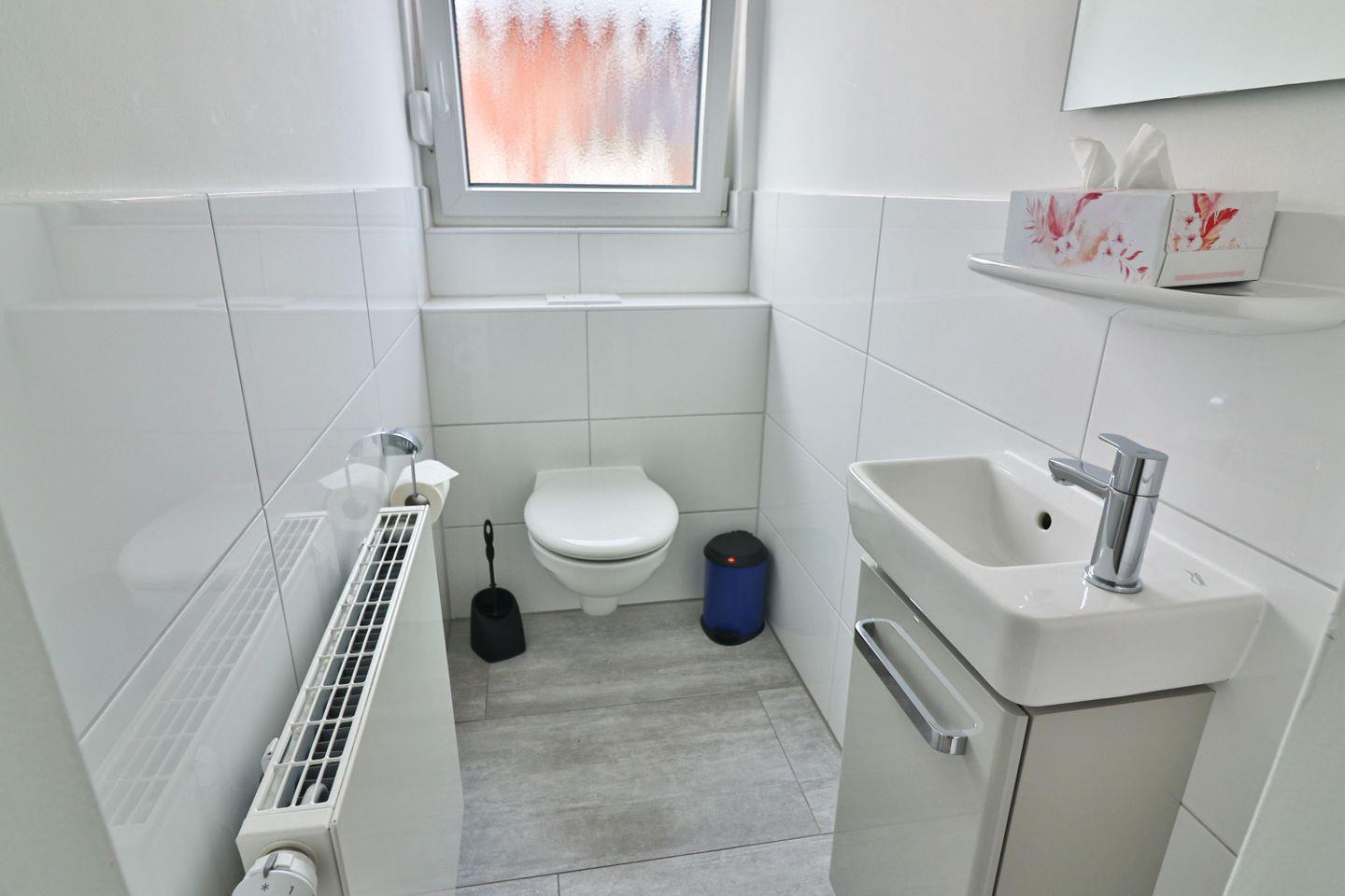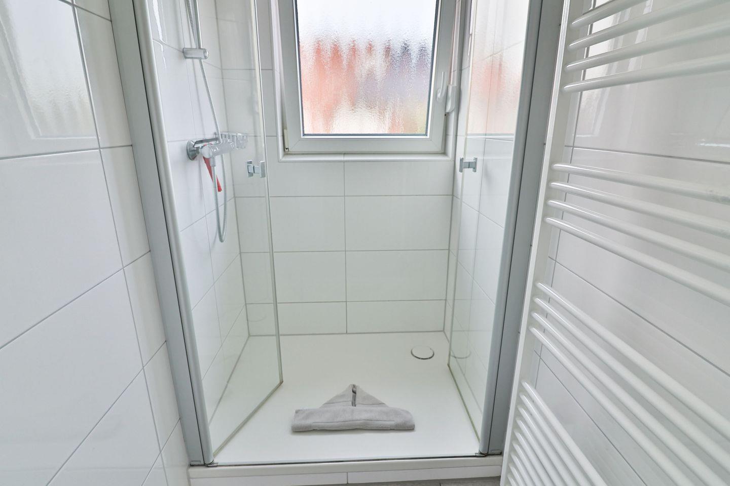 Das Badezimmer der Wohnung ist mit einer Dusche und einer Handtuchheizung ausgestattet, die für eine angenehme Atmosphäre sorgt. Ein separates WC ergänzt den Komfort der Wohnung.