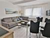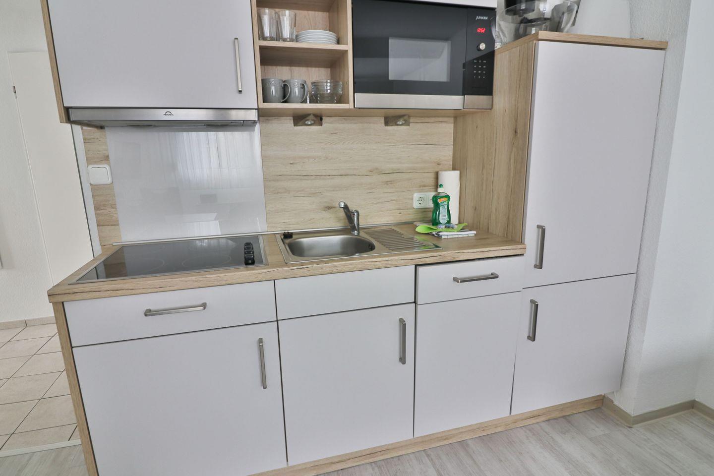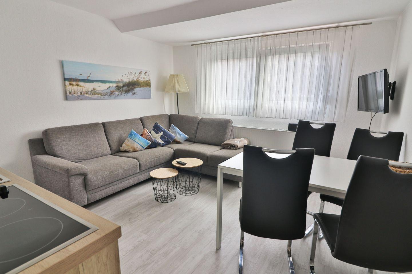 Das offene Wohn- und Esszimmer der Ferienwohnung „Seehund“ lädt zum Verweilen ein. Hier befindet sich eine gut ausgestattete Küchenzeile mit modernen Annehmlichkeiten wie einem Ceranfeld, einer Mikrowelle, einem Kühlschrank und einer Spülmaschine. Zusätzlich stehen Ihnen eine Kaffeemaschine, ein Wasserkocher, ein Toaster und ein Eierkocher zur Verfügung – perfekt für ein entspanntes Frühstück oder ein gemeinsames Abendessen. Der gemütliche Wohnbereich mit Sofa, Sessel und Fernseher bietet ausreichend Platz, um nach einem langen Strandtag zu entspannen.