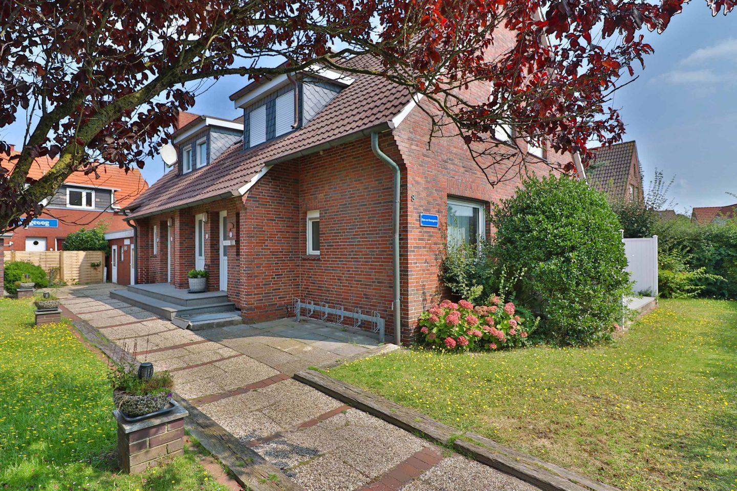 Vor dem Haus befindet sich eine Terrasse, die von den Gästen der Wohnung genutzt werden kann. Hier können Sie die frische Nordseeluft genießen, während die Kinder spielen oder Sie einfach den Tag Revue passieren lassen.