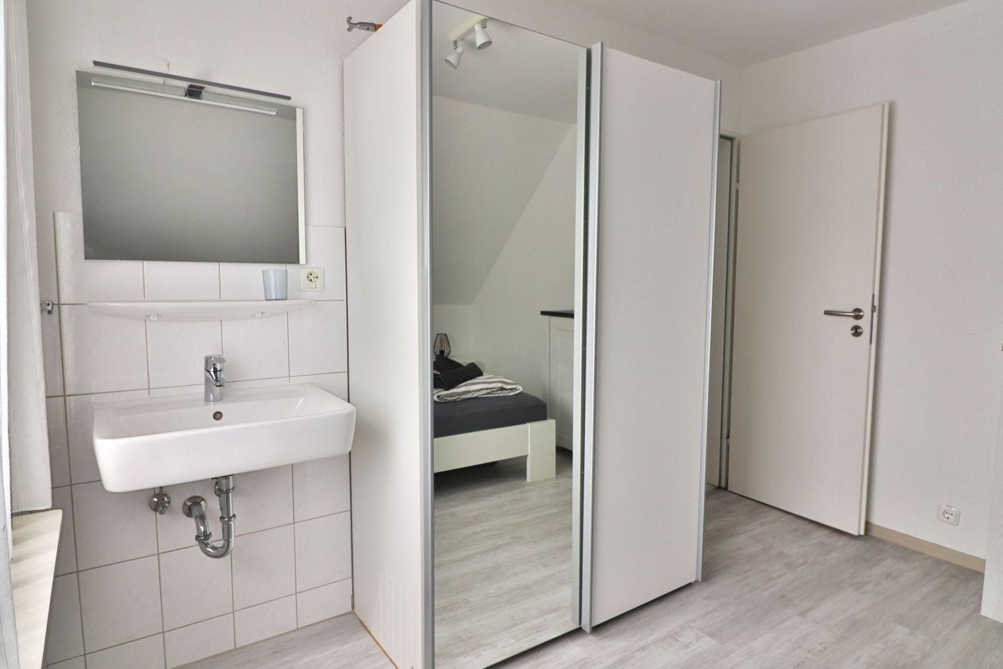 Die Wohnung verfügt über zwei gut ausgestattete Schlafzimmer. Das erste Schlafzimmer bietet mit einem komfortablen Doppelbett (180 x 200 cm), einem großzügigen Kleiderschrank, einer Kommode und einem eigenen Waschbecken alles, was Sie für erholsame Nächte und einen angenehmen Aufenthalt benötigen. Im zweiten Schlafzimmer finden Sie zwei Einzelbetten (je 90 x 200 cm) sowie ebenfalls einen Kleiderschrank und ein Waschbecken, was besonders praktisch für Kinder oder weitere Gäste ist.