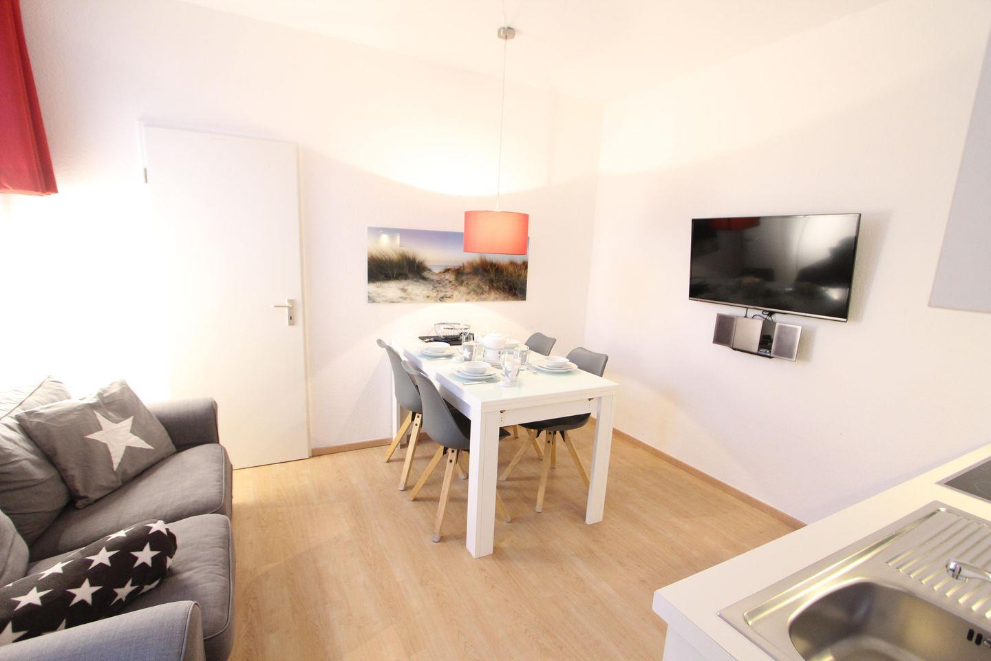 Die Wohnung hat eine Größe von ca. 43 m² und ist für bis zu 4 Personen buchbar. Sie verfügt über einen Garten, Terrasse und Strandkorb.