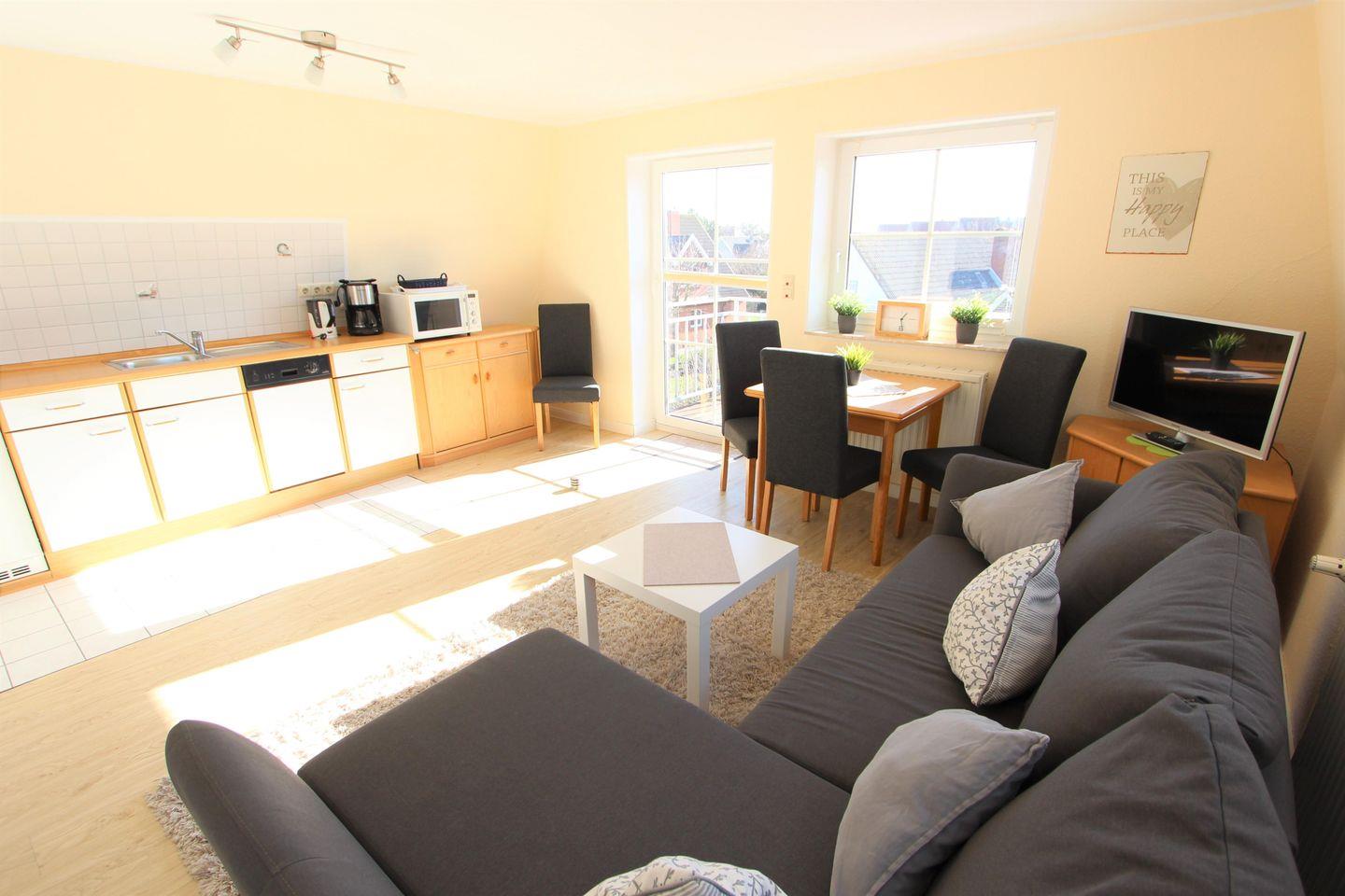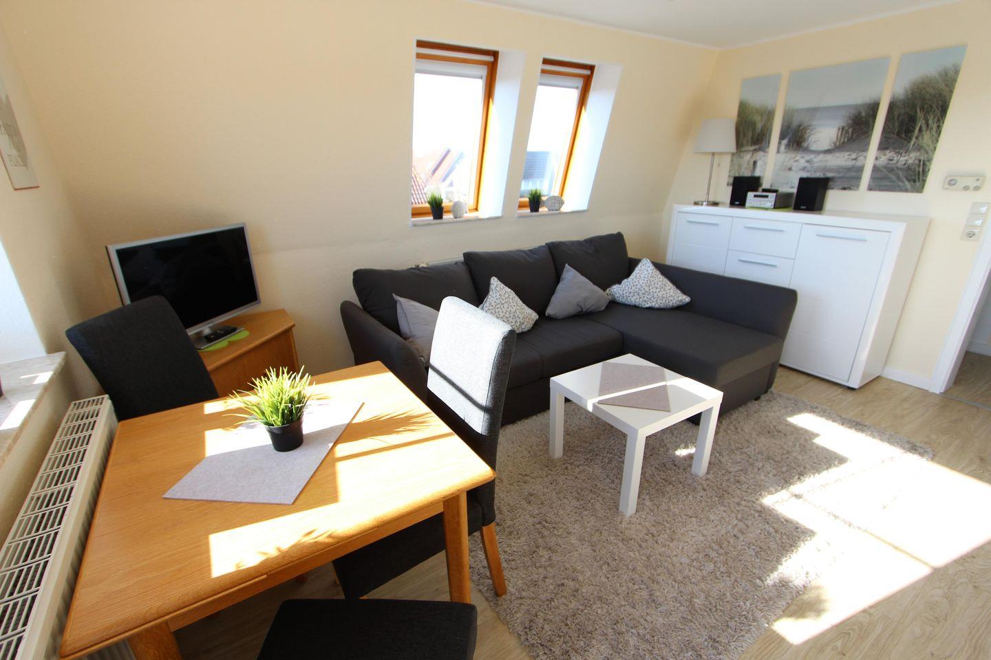 Gemütliche, sonnige und helle Ferienwohnung in 2. Etage für bis zu 3 Personen. Zentrale Lage nahe am Ortskern, dennoch ruhig und mit allen Versorgungsmöglichkeiten. Bäckerei ca. 50 m, Bahnhof ca. 300 m, zum Strand wenige Gehminuten. Die Wohnung verfügt über einen Balkon zur Südseite, mit Blickrichtung Bahnhof. 1 Schlafzimmer mit einem Doppelbett und großem Kleiderschrank, das Bad hat Tageslicht mit weit zu öffnendem Fenster, Dusche/WC. Im Wohn-/Essbereich mit Schlafsofa (1 Person) bietet die vollständig eingerichtet Einbauküche einen Geschirrspüler, Kühlschrank, Kaffeemaschine, Mikrowelle mit Backfunktion, Toaster und Wasserkocher. Im Wohnbereich warten ein bequemes Sofa, ein Couchtisch sowie ein Esstisch mit 3 Stühlen, Kabel-TV und eine HiFi Anlage mit CD Player. Münzwaschmaschine und Trockner befinden sich in einem separaten Hauswirtschaftsraum. Wir stellen Ihnen gerne auf Anfrage ein Kinderreisebett sowie einen Kinderhochstuhl kostenfrei zur Verfügung.