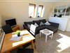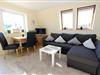Wohnung, Südbalkon, 1 Schlafzimmer mit einem Doppelbett, Tageslichtbad mit Dusche und WC, Wohn-/Essbereich mit Schlafsofa (1 Person), Einbauküche mit Geschirrspüler, Kühlschrank, Kaffeemaschine, Mikrowelle mit Backfunktion, Toaster, Wasserkocher. Wohnbereich mit Essecke, Kabel-TV, Münzwaschmaschine/Trockner, auf Anfrage Kinderreisebett und Kinderhochstuhl