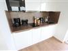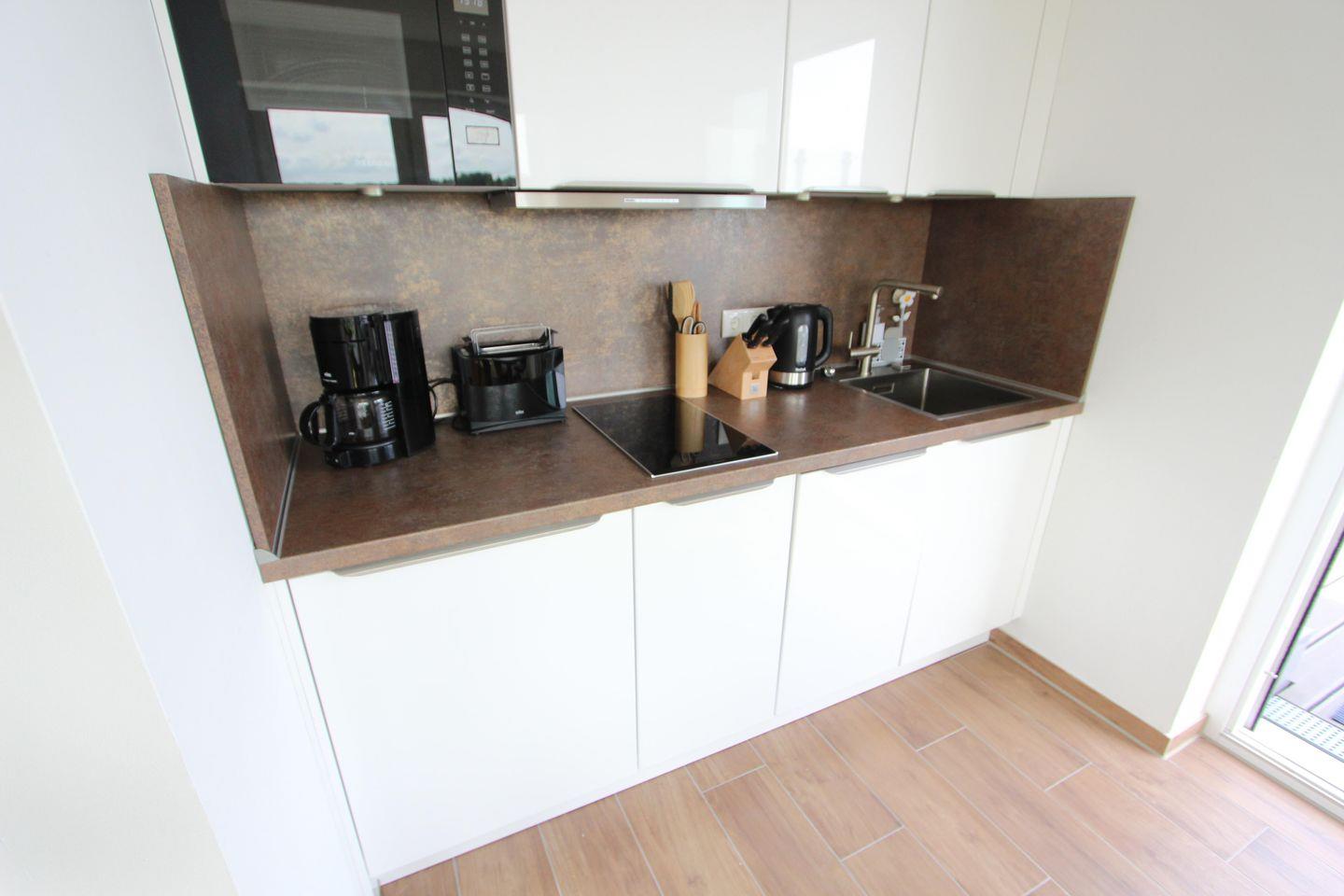 Im Wohnzimmer befindet sich die voll ausgestattete Küchenzeile u. a. mit Cerankochfeld, Geschirrspüler und vielen weiteren Küchenhelfern.