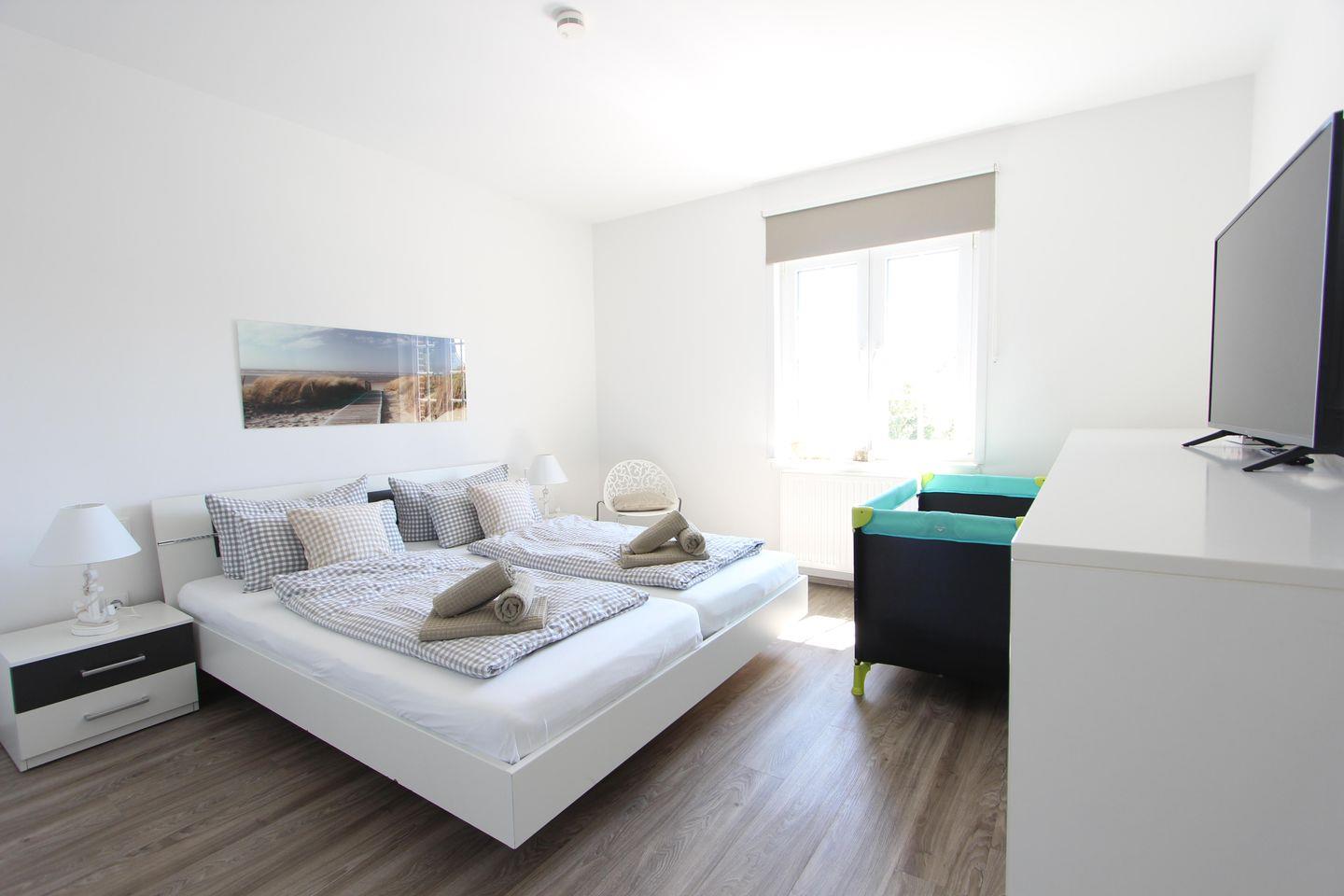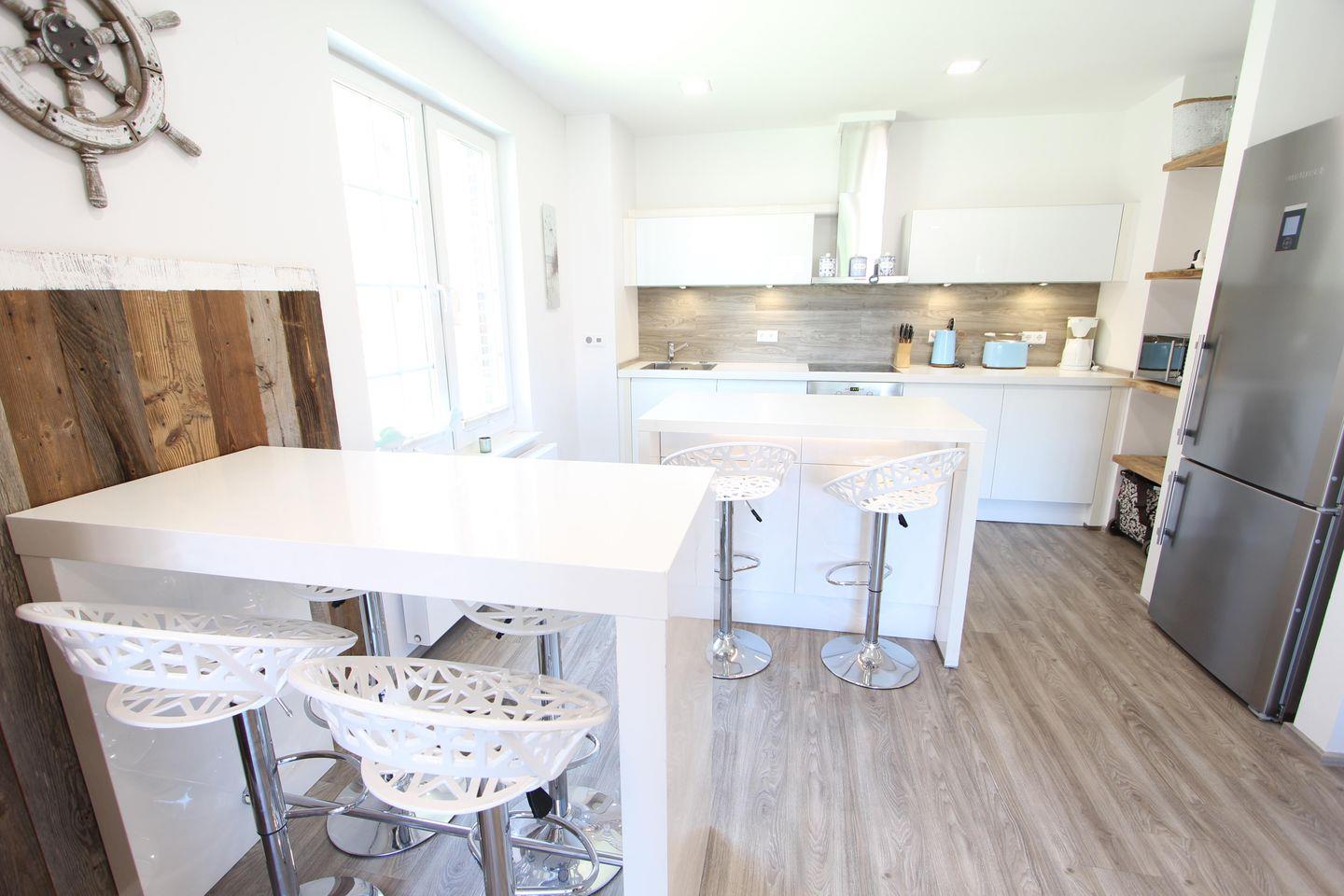 Hochwertig ausgestattete Ferienwohnung über 2 Etagen, geeignet für insgesamt 9 Personen, ca. 180 m², mit Gartenanteil und Terrasse, welche mit bequemen Sitzmöbeln und einem schönen Strandkorb ausgestattet ist. Sep.Esszimmer mit großem Esstisch und Sitzgelegenheiten für bis zu 10 Personen mit Stereoanlage und integriertem Internetradio. Großzügig offene Wohnküche mit Spülmaschine, Toaster, Mikrowelle, Backofen, amerikanischem Kühlschrank mit zusätzlichem Eiswürfelspender, Wasserkocher und Kaffeemaschine. Wohnraum mit großem Sofa und Flachbildschirm, ein Gäste-WC im EG. Fünf Schlafzimmer im Obergeschoss (3 mit Doppelbett, 1 mit Etagenbett, 1 mit Einzelbett teils mit zusätzlichem Flachbildschirm ) modernes Bad mit Dusche und WC. WLAN ist vorhanden.