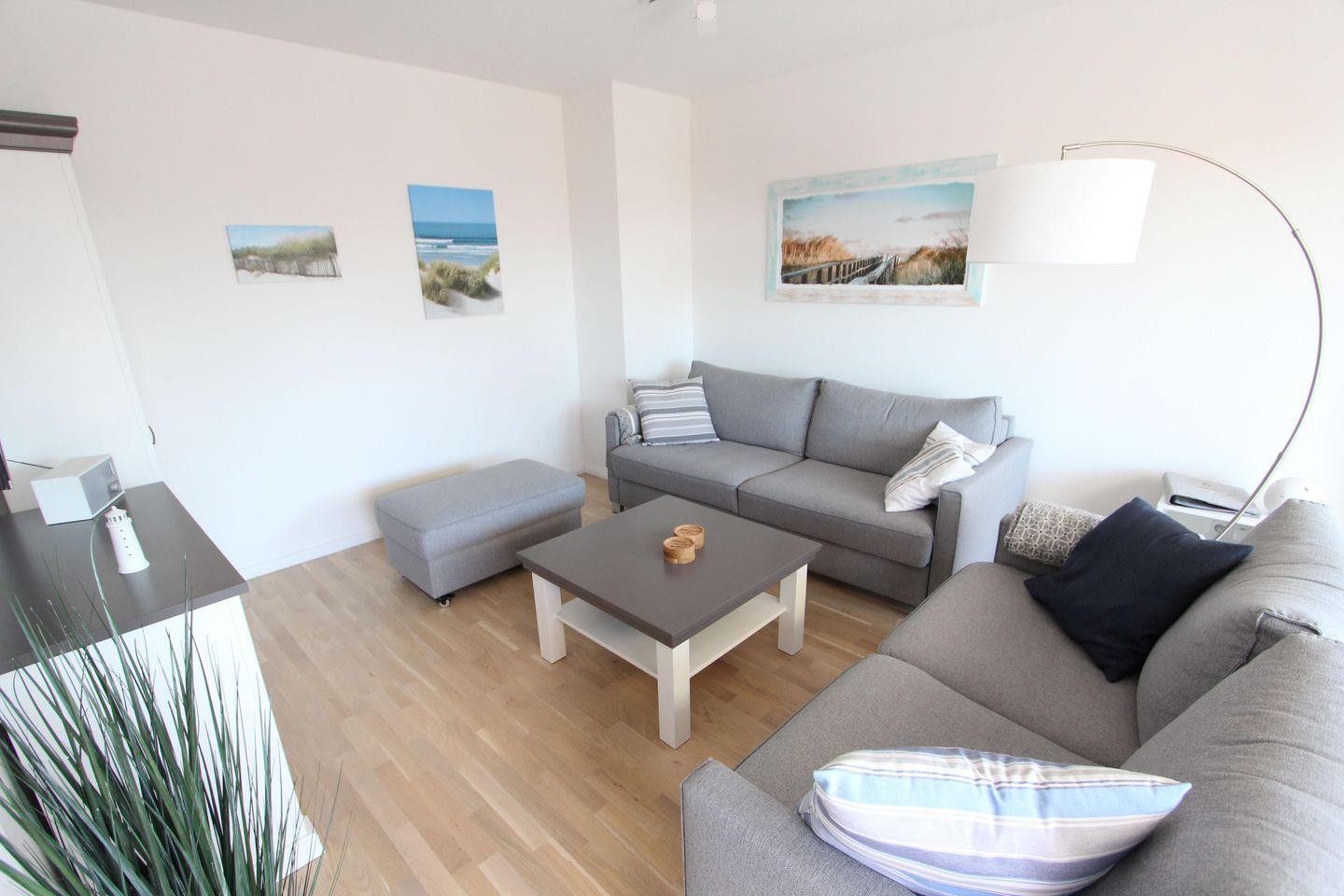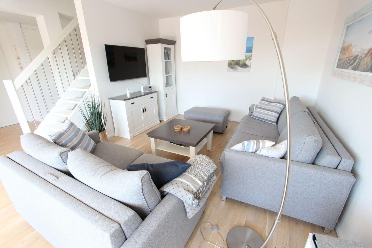 Die Küchenzeile ist komplett und modern ausgestattet u.a. mit Geschirrspüler, Backofen, Kochfeld und vielen weiteren Küchenhelfern. Im gemütlichen Wohnzimmer befinden sich zwei moderne Sofas zum Relaxen. Das Badezimmer ist mit einer großen ebenerdigen Dusche ausgestattet. In den Schlafzimmern steht je ein großes Doppelbett mit den Maßen 180 x 200cm und 200 x 200cm.