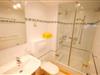 Das Bad verfügt über eine großzügige Dusche, ein Waschbecken sowie eine Miele-Waschmaschine.