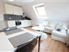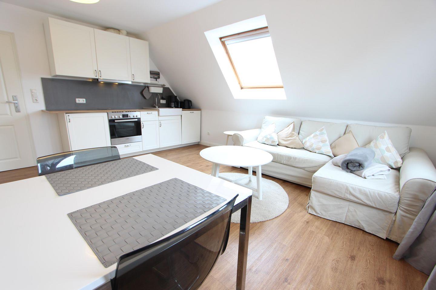 lichtdurchflutetes Wohnzimmer, voll ausgestattete Küchenzeile und ein gemütliches Schlafzimmer mit großem Doppelbett, Wohnzimmern mit Schlafsofa.