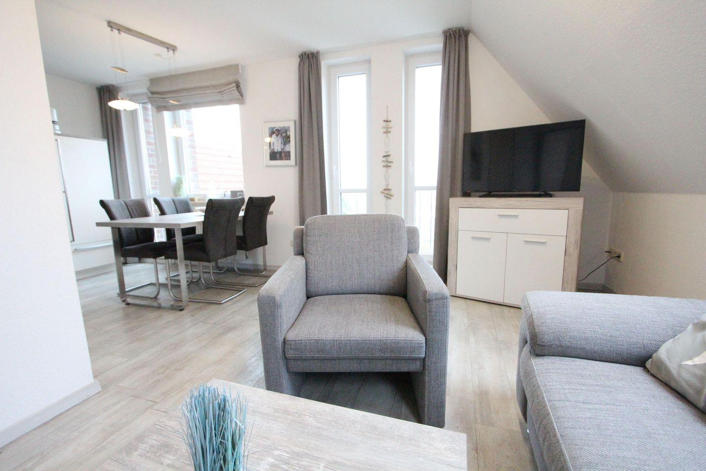 Wunderschön ausgestattete Ferienwohnung, in unmittelbarer Nähe zum Strand und nahe zum Ortskern von Langeoog, ca. 40 m², eine Wohnküche mit Essgelegenheiten, Wohnküche mit bequemer Couch und Flachbildfernseher, komplett ausgestattete Einbauküche mit Backofen, Spülmaschine, Mikrowelle, Toaster, Kaffeemaschine und Wasserkocher.