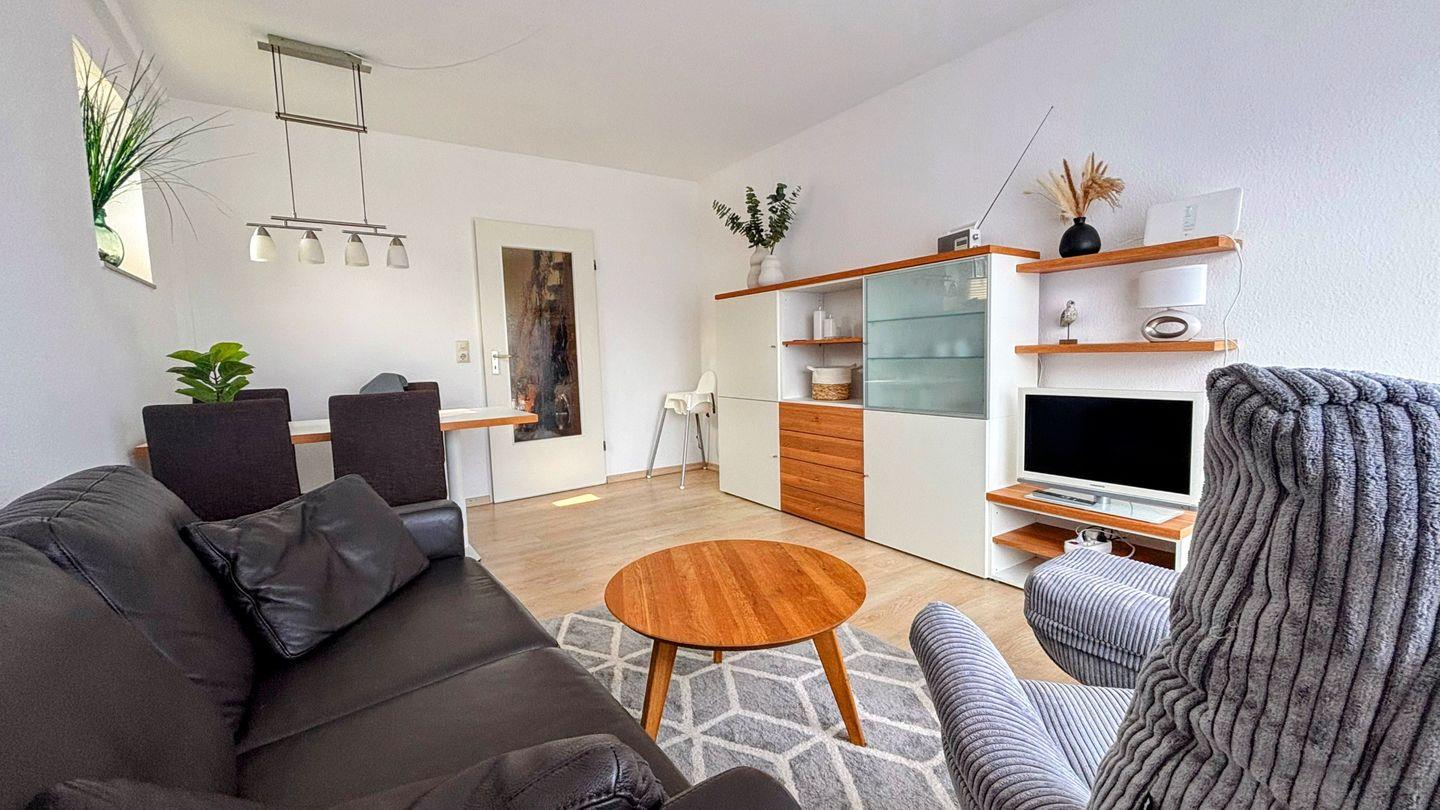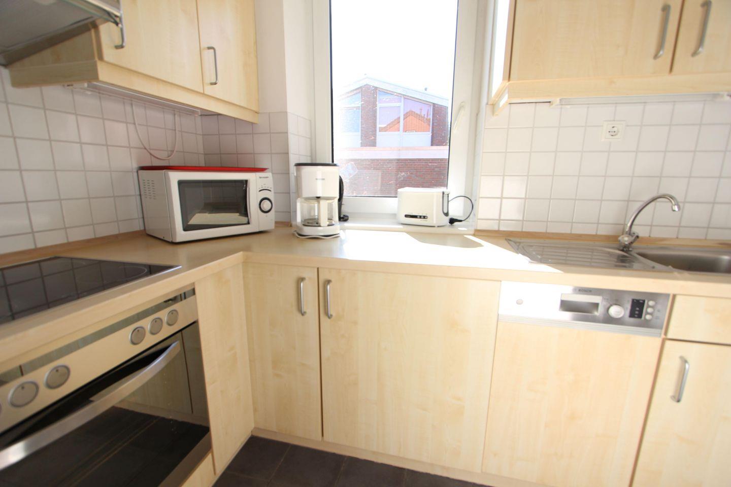 EG: Süd-Terrasse und Garten; großzügiger heller Wohnbereich mit Sitz- und Essecke, Flatscreen-TV, Radio; voll ausgestattete separate Küche mit Herd/Backofen, Geschirrspüler, Mikrowelle, Filterkaffeemaschine; Gäste-WC mit Tageslicht.