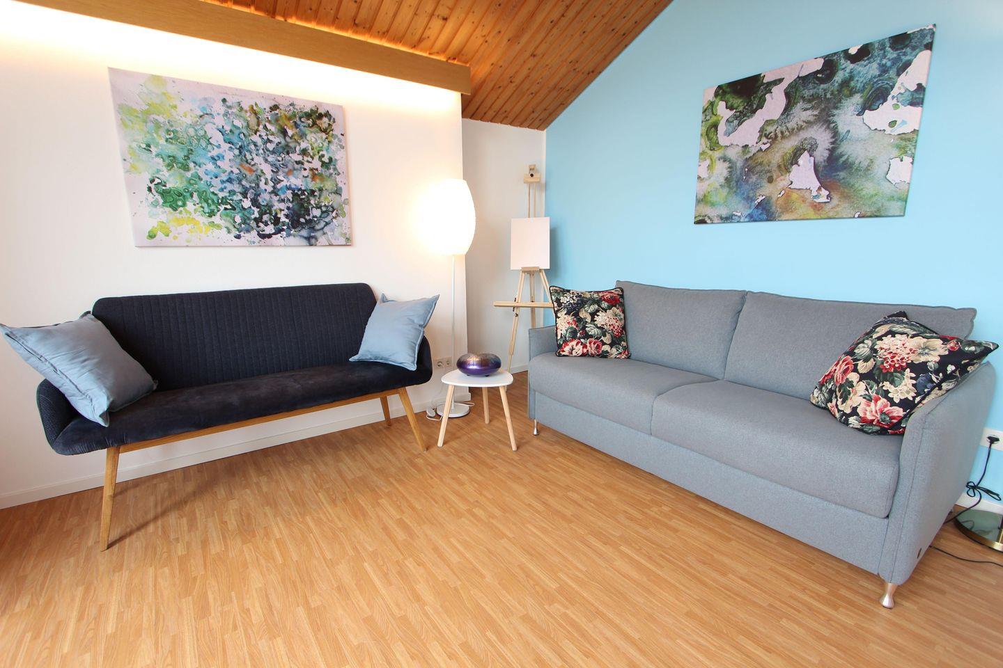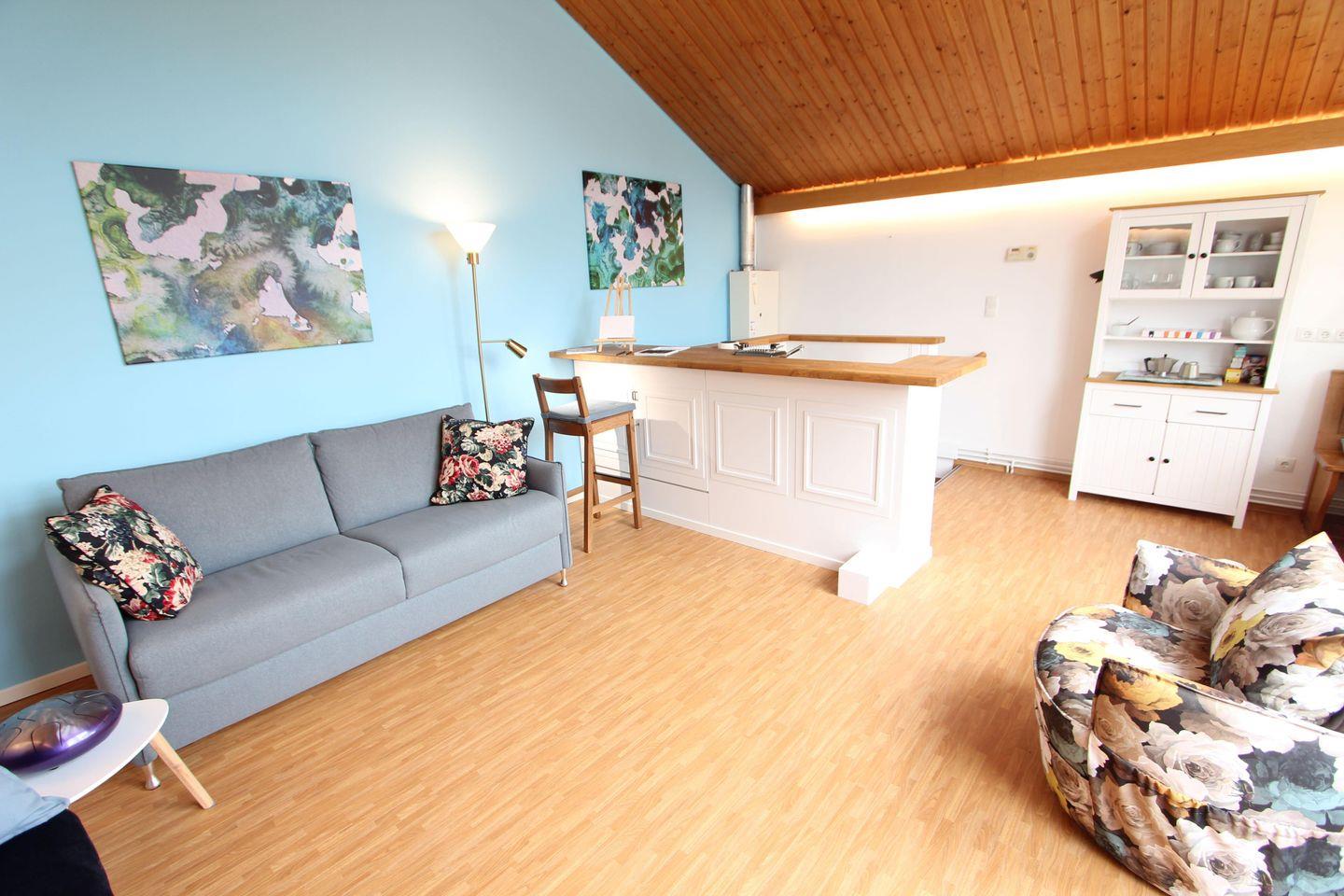 Im OG lädt das lichtdurchflutete Wohnzimmer zum Verweilen ein. Hier befindet sich auch die Schlafcouch mit den Maßen 1,40 m x 2,00 m für die 3. Person (ab 10 Jahre). Der Essbereich befindet sich in einem hellen Wintergarten mit tollem Blick auf Langeoog.