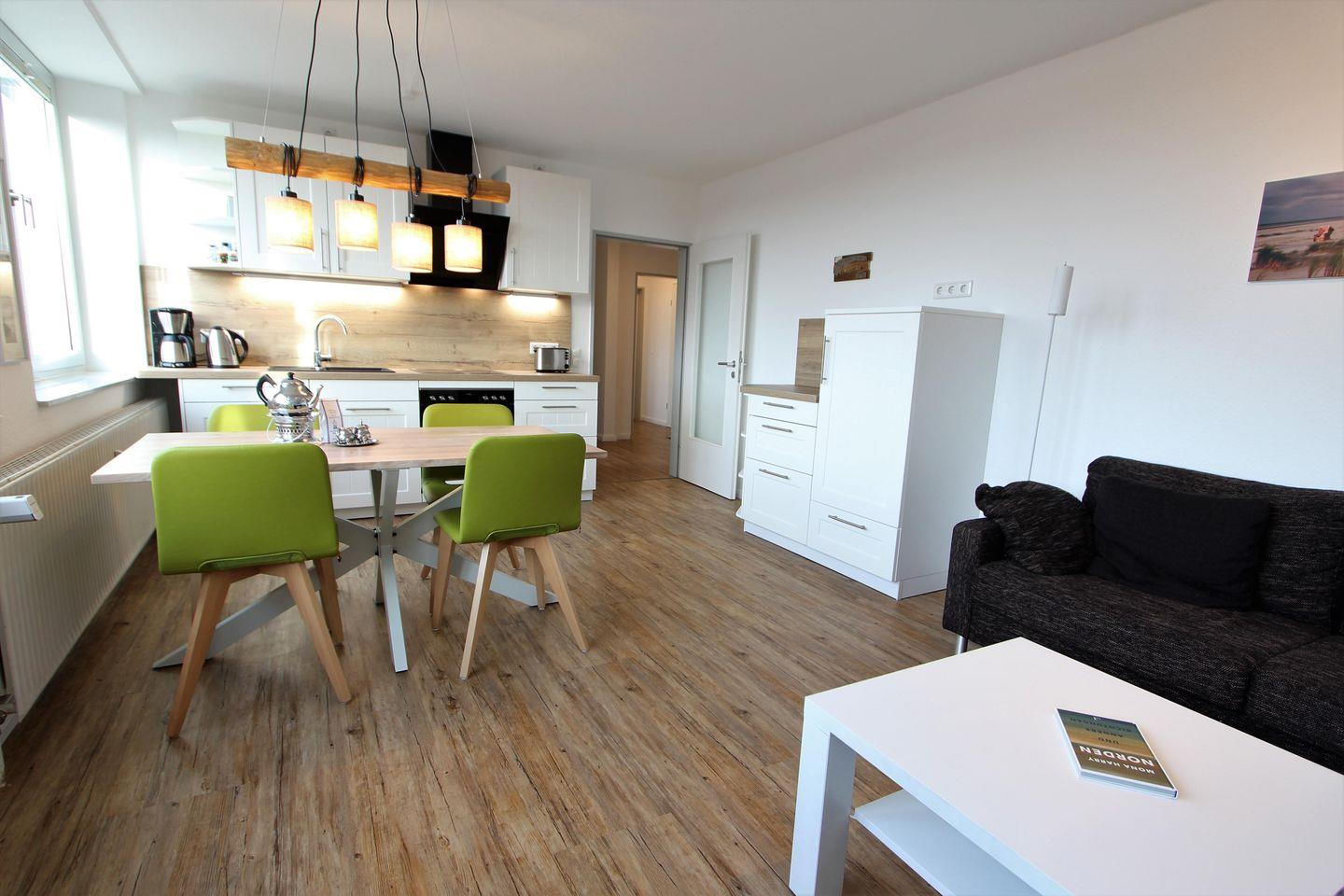 Im Wohnzimmer befindet sich eine gemütliche Couchecke und die voll ausgestattete Küchenzeile u.a. mit einem Geschirrspüler, Backofen mit Ceranfeld und vielen weiteren Küchenhelfern.