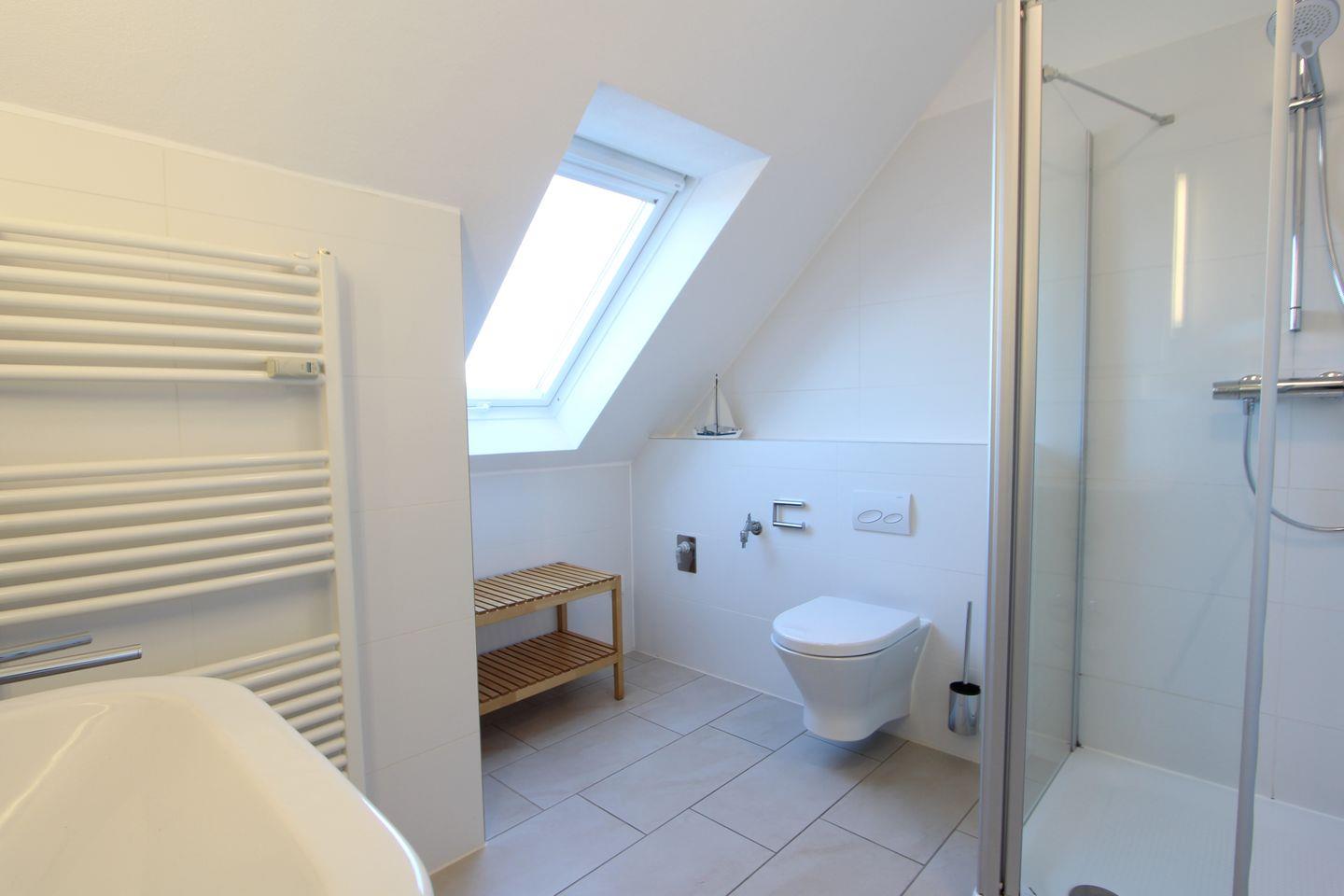 Das Tageslichtbadezimmer verfügt über eine Dusche und WC.
