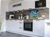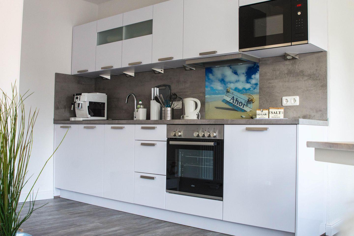 Eine moderne Kombüse mit Eckbank, Ceranfeld, Backofen, Mikrowelle, Spülmaschine, De Longhi Kaffeemaschine, Kühlschrank und Gefrierfach. Zustellbett möglich