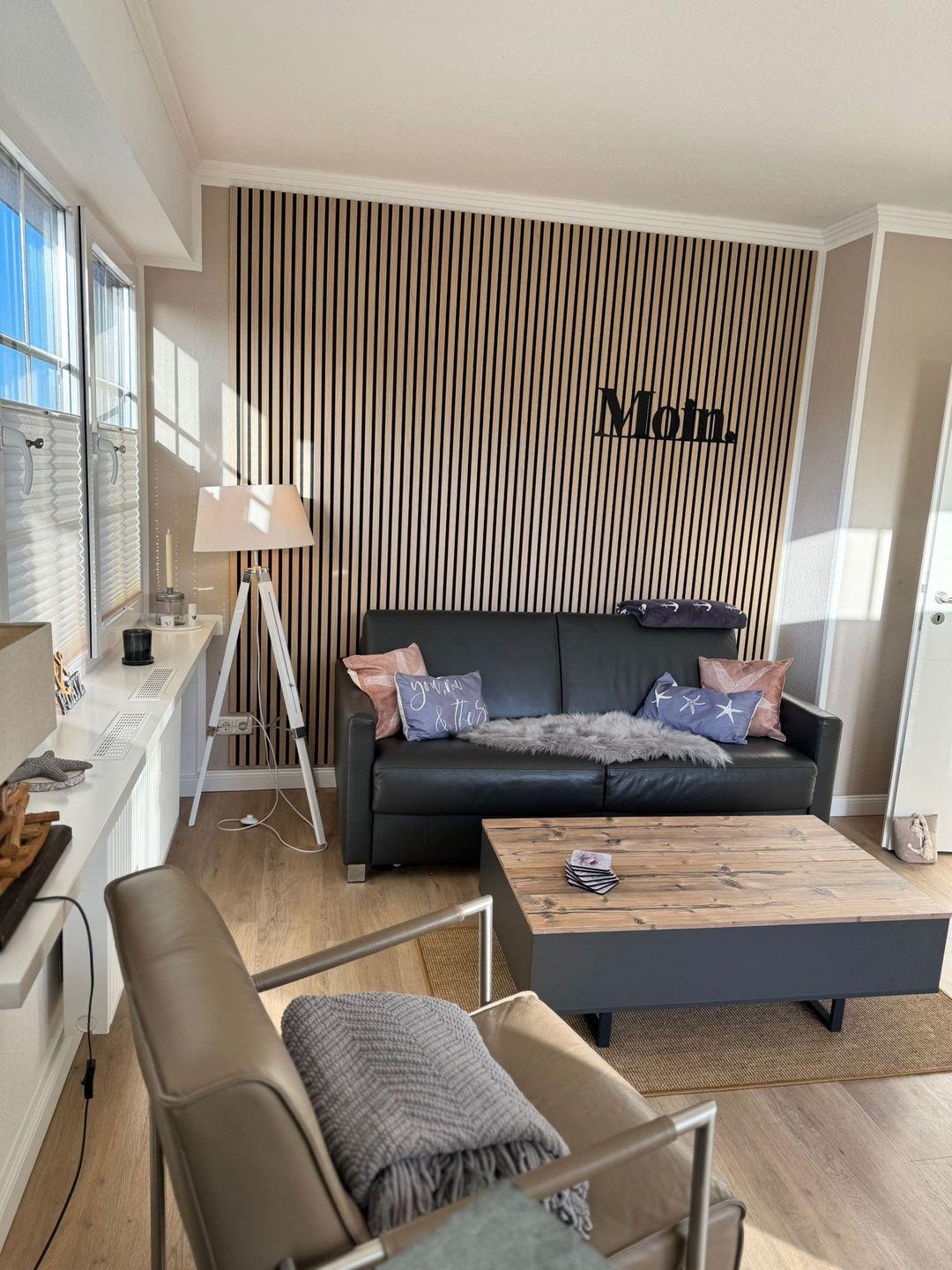 Wohnbereich mit Ledersofa , großer Balkon (24 m²)