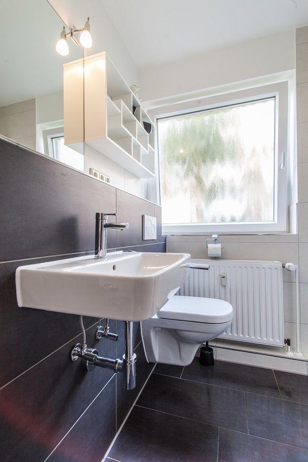 Modernes Bad mit Dusche und WC. Offene Wohnküche mit Küchenzeile und Esstisch, 4-fach Cerankochfeld, Kühlschrank, Mikrowelle und Geschirrspülmaschine.