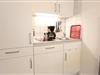 Die Küchenzeile bietet unter anderem ein Cerankochfeld, einen Kühlschrank mit Gefrierfach und einen Geschirrspüler.