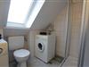 Badezimmer mit Dusche und WC sowie Münzwaschmaschine und Trockner.