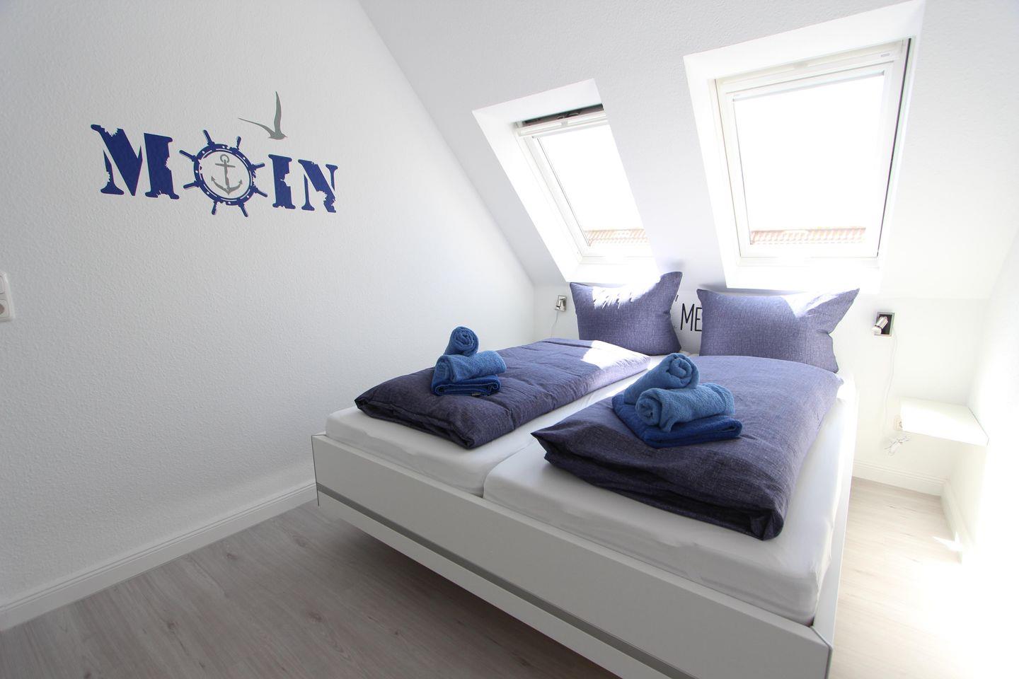 Das Schlafzimmer mit dem Doppelbett hat eine Liegefläche von 160 cm x 200 cm.