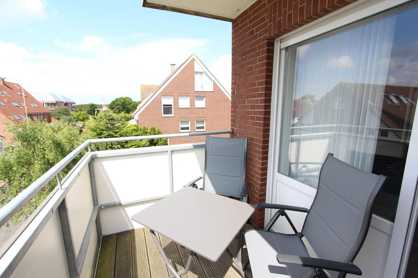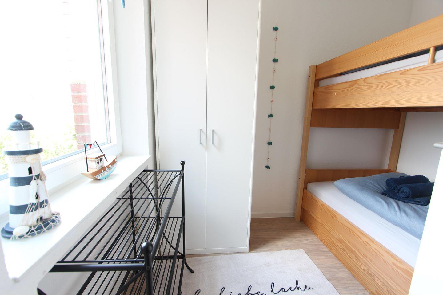 Ferienwohnung, für bis zu 4 Personen, ein Schlafzimmer mit einem Doppelbett, ein Zimmer mit einem Etagenbett, Südbalkon mit zwei Liegestühlen und einem Tisch