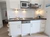 Die kleine Küchenzeile ist mit einer Mikrowelle, einem Geschirrspüler und einem Herd ausgestattet.