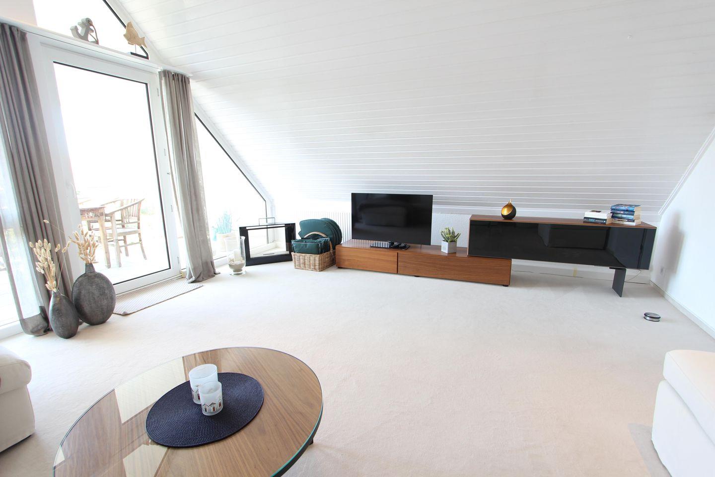 Großes Wohnzimmer, bodentiefe Fenster, Flat-TV